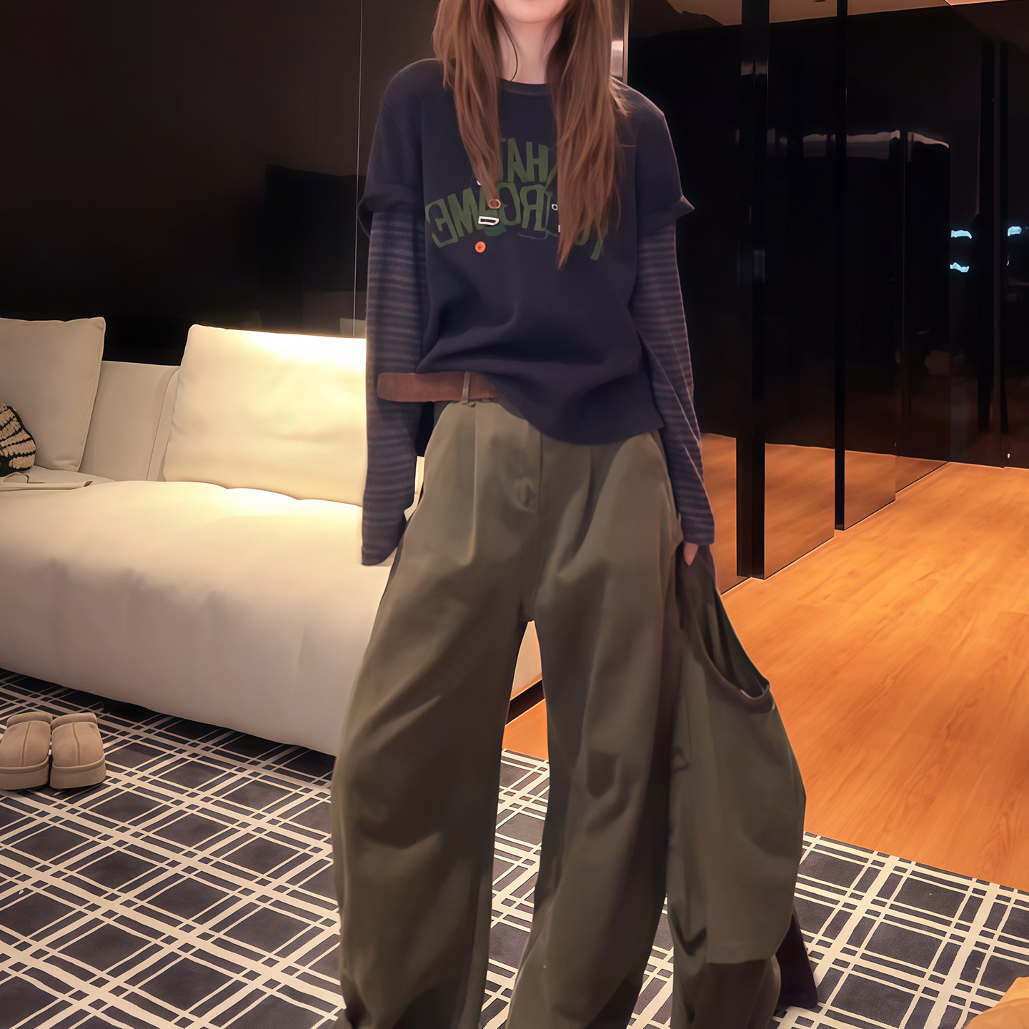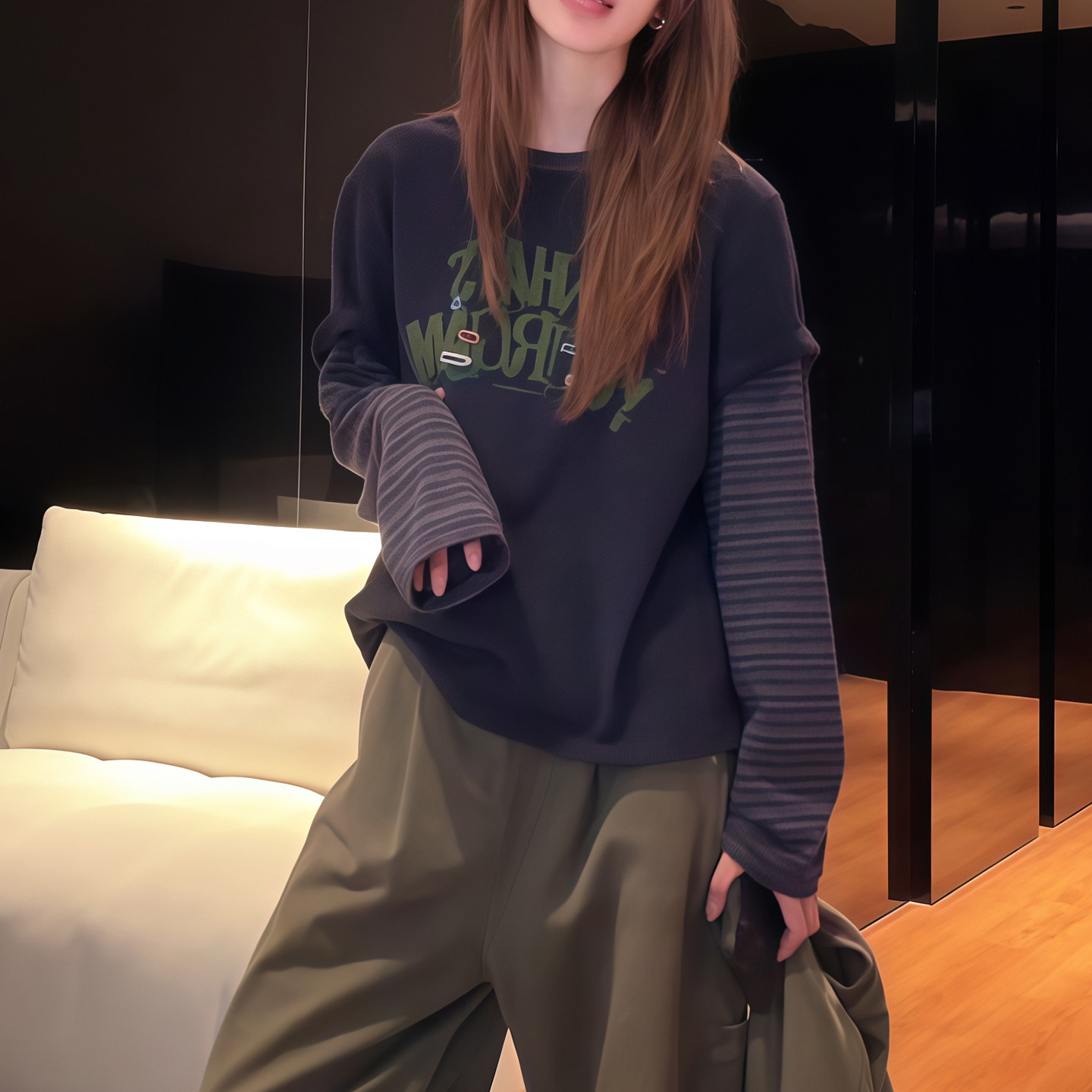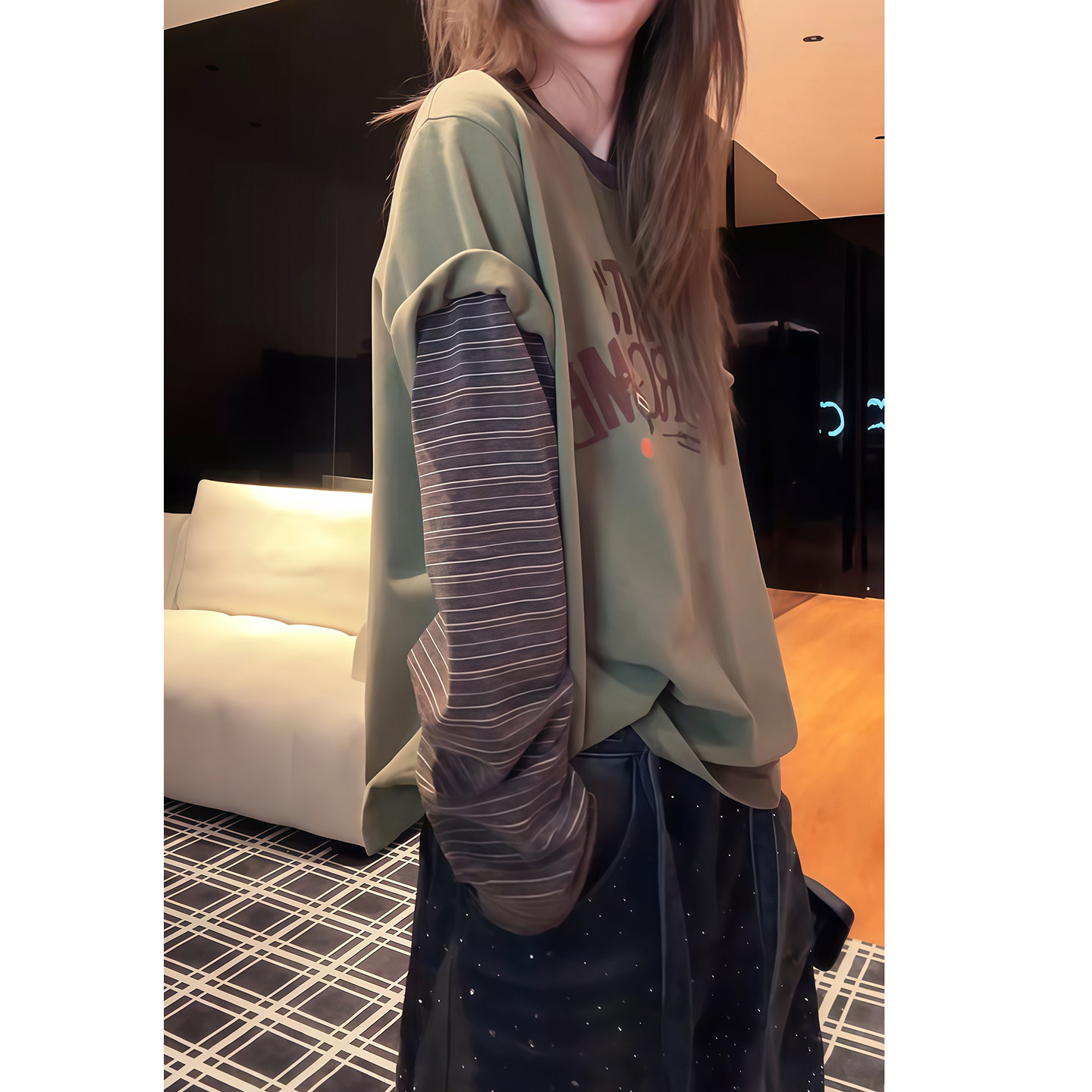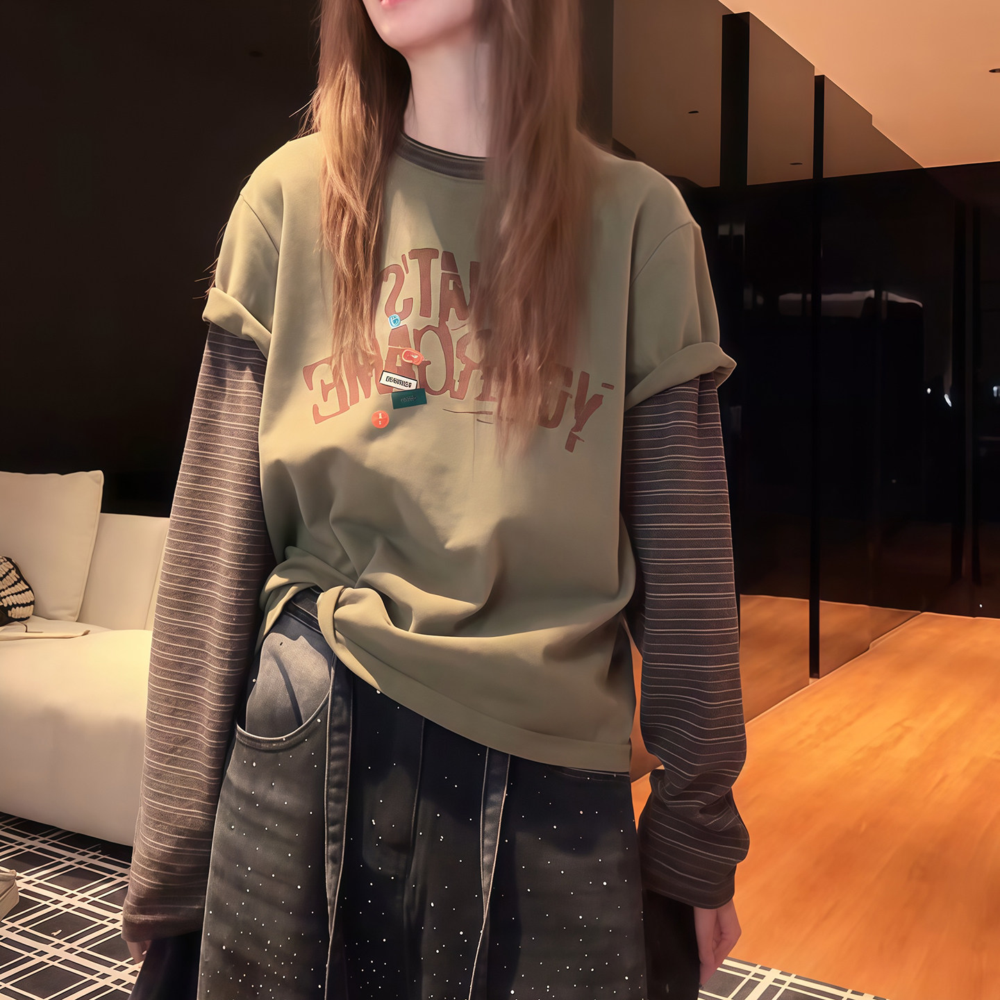 假两件拼接长袖t恤女2026春季新款爆款宽松百搭大码胖mm女士上衣