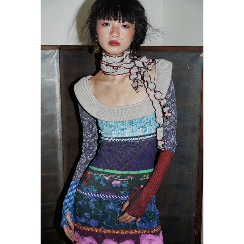 坏品味西部 设计感印花拼接撞色修身长款连衣裙送脖绳