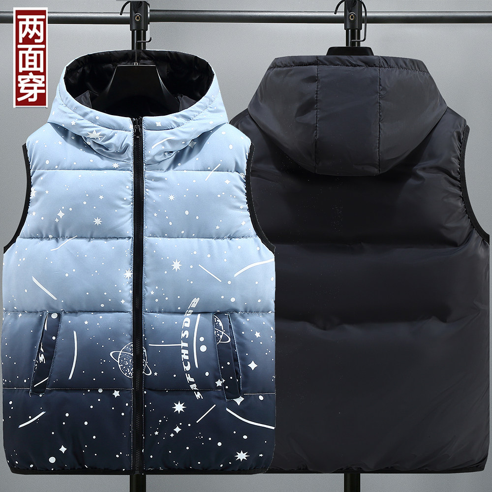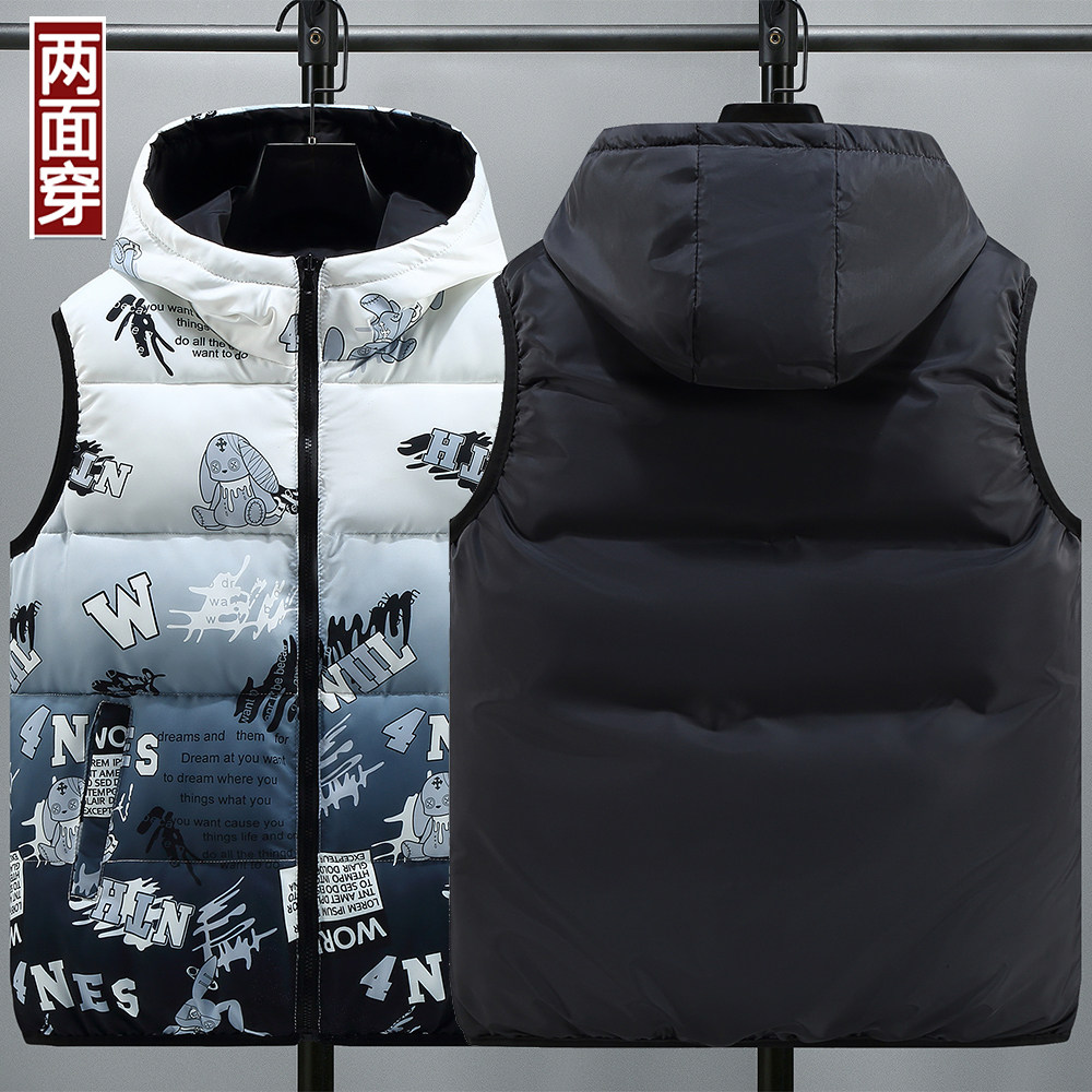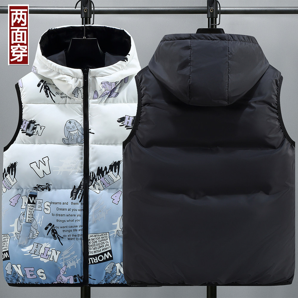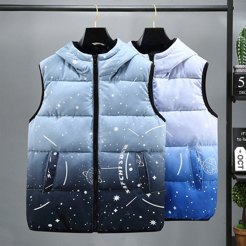 男童青少年渐变保暖羽绒棉马甲男装满印带帽初中学生校服外穿坎肩