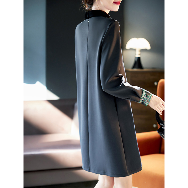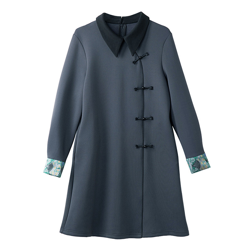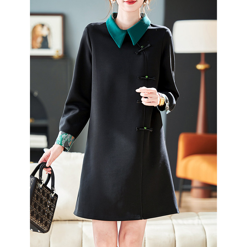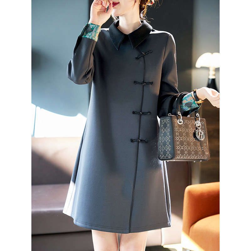 宝诗黎翻领盘扣中式直筒连衣裙2026春装新款长袖拼接女士中长裙子