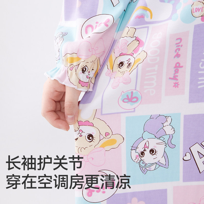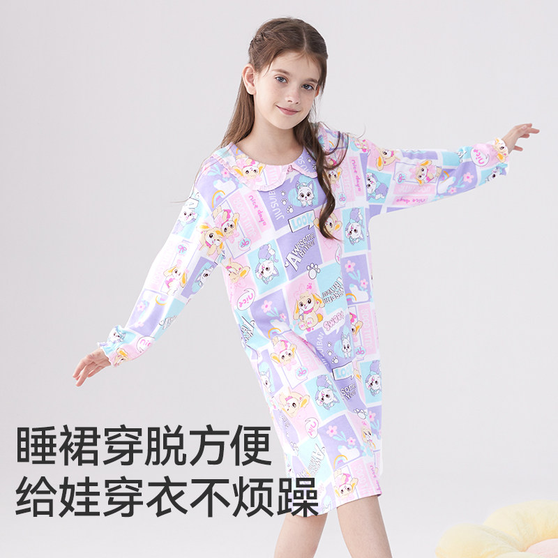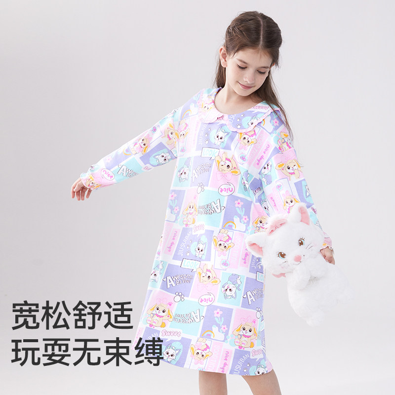 久岁伴女童睡裙2023春秋新款长袖薄款睡衣小女孩卡通家居服连衣裙