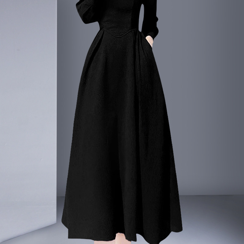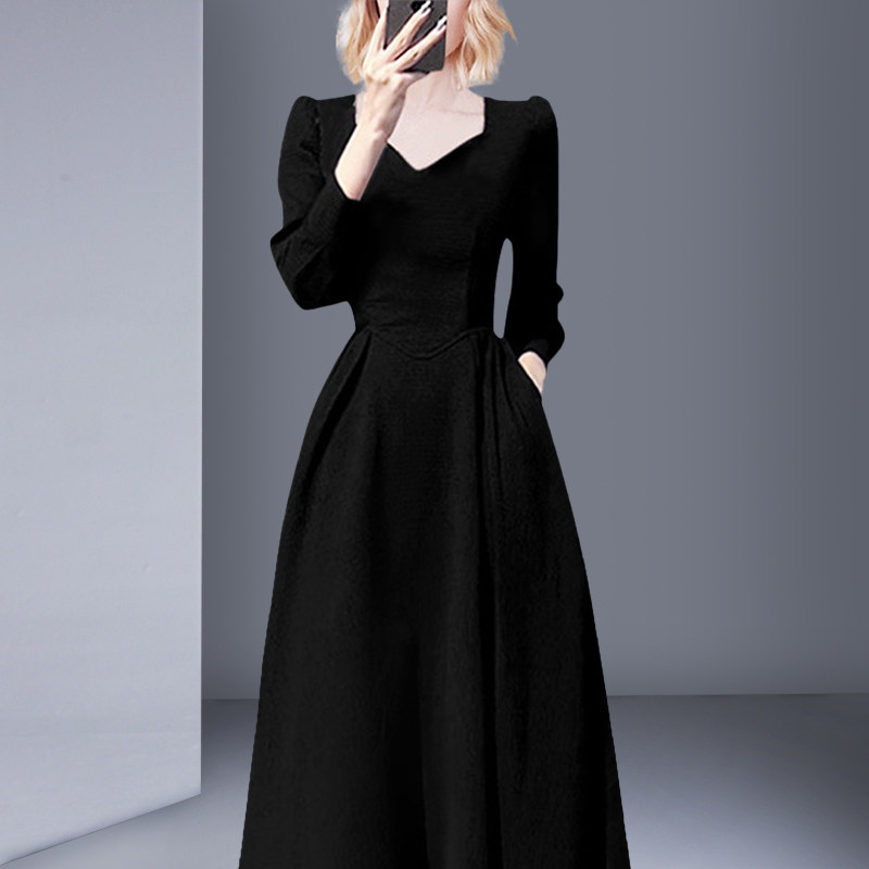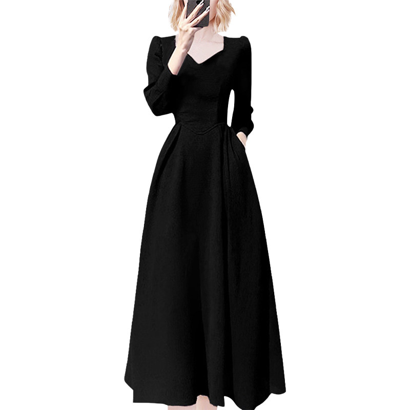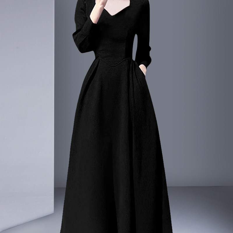 法式高端精致长袖连衣裙2026春季新款方领黑色赫本风长款收腰显瘦