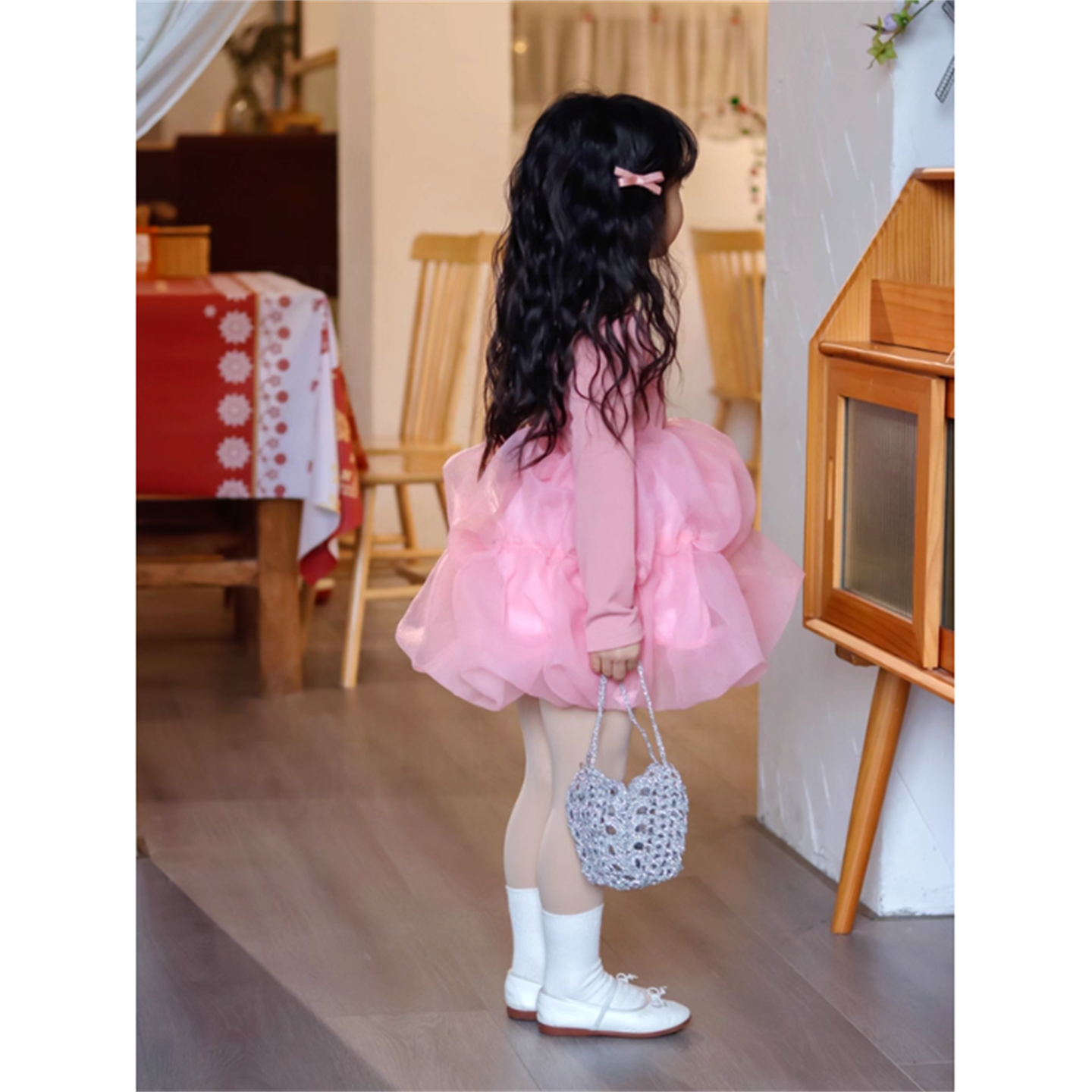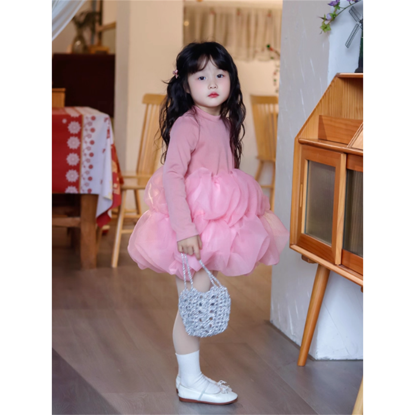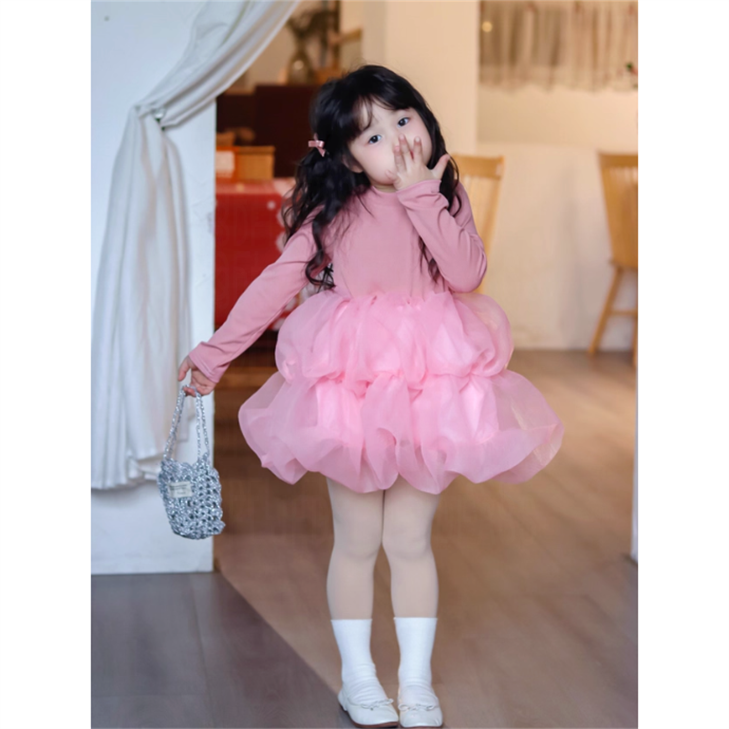 女童连衣裙2025秋季新款女孩长袖粉色网纱蓬蓬公主裙女宝宝礼服裙