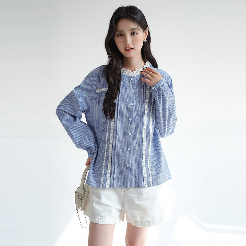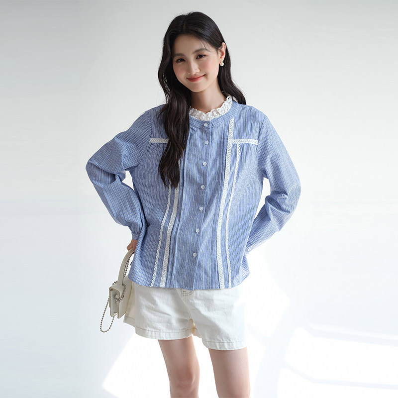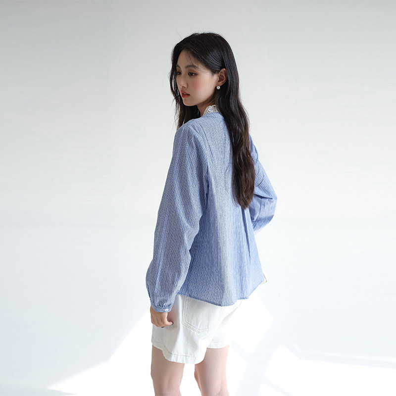 311线报网描述:高端气质蕾丝立领条纹衬衫时尚宽松蓝色上衣