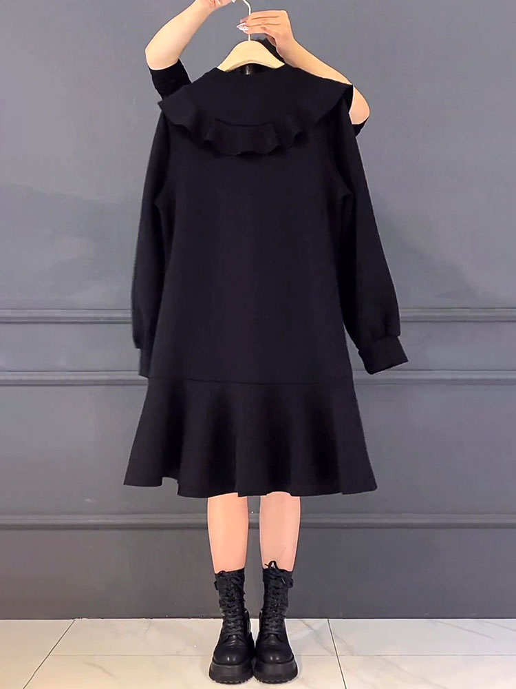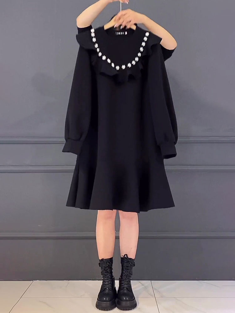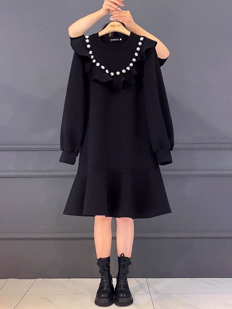 胖mm秋冬钉珠连衣裙加绒荷叶边卫衣裙大码中长款遮肚显瘦鱼尾女裙