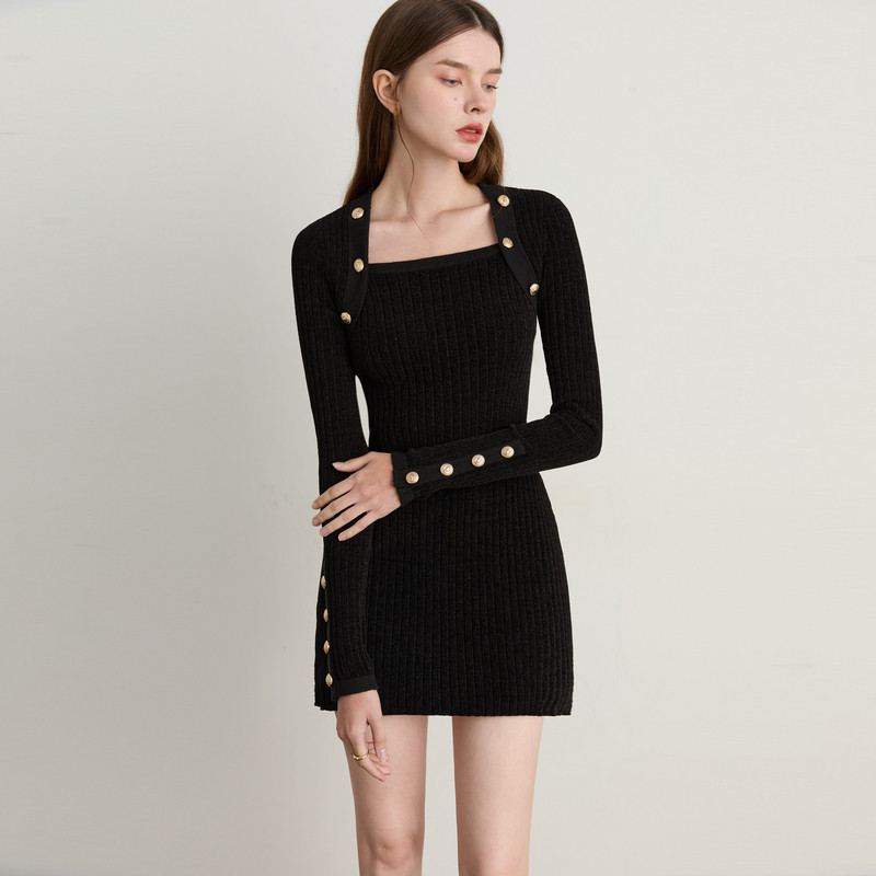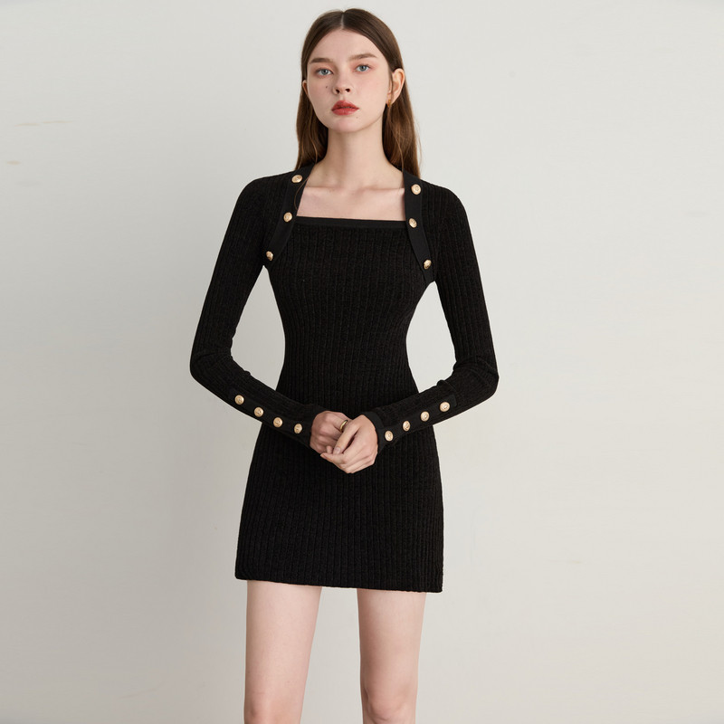DPLAY2025年冬季新款黑色针织连衣裙女方领收腰短裙修身短款裙子