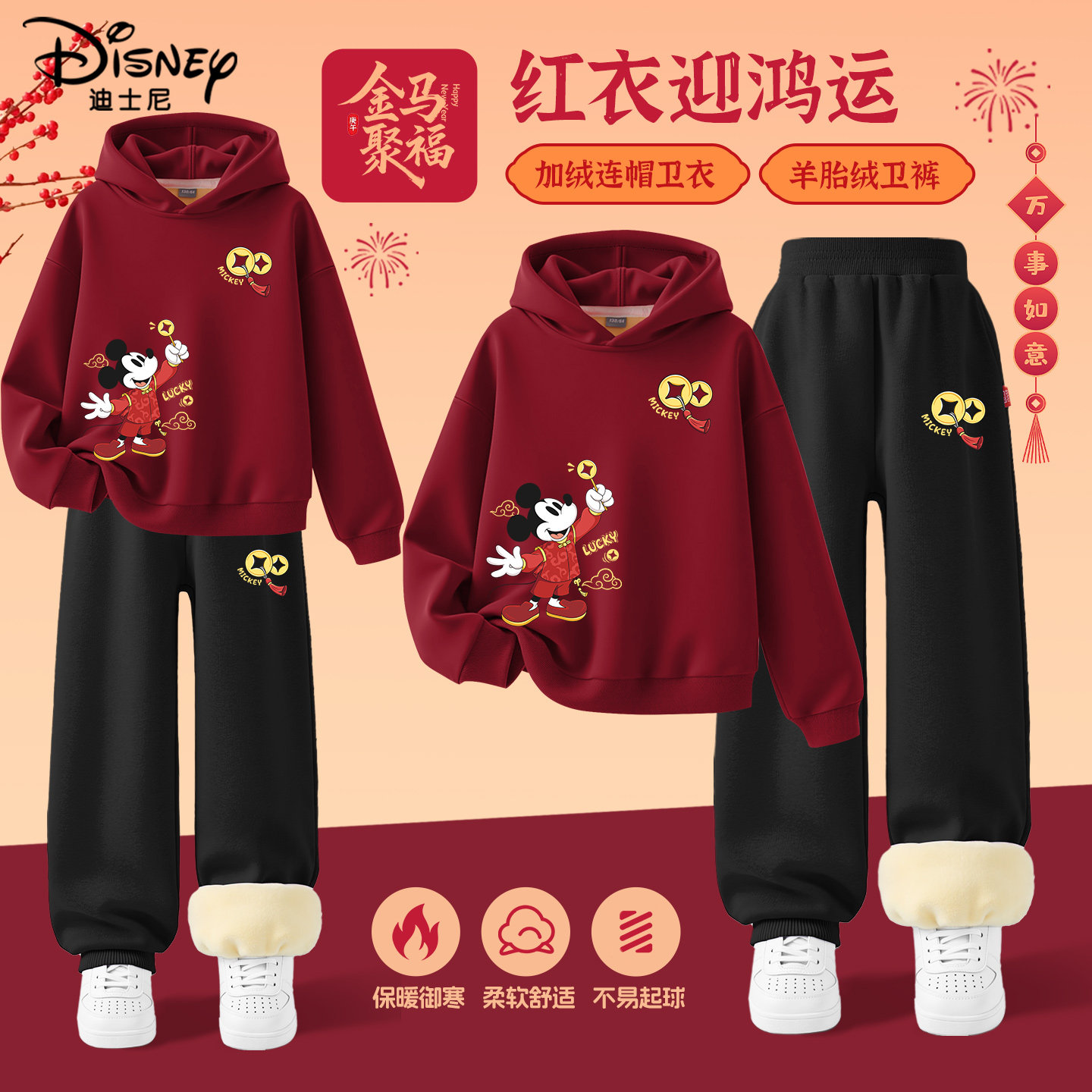 迪士尼拜年服男童加绒套装马年新款本命年红色卫衣卫裤儿童冬装男