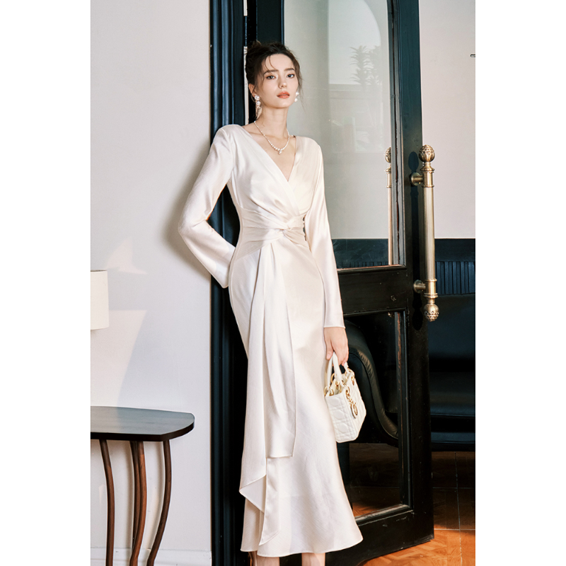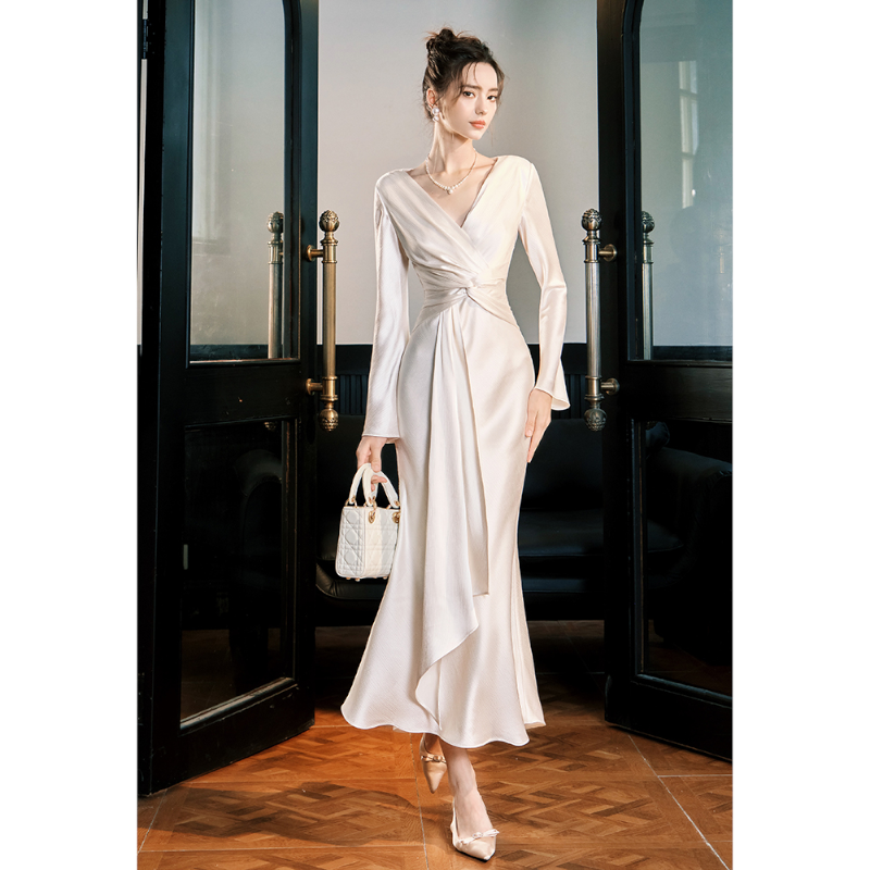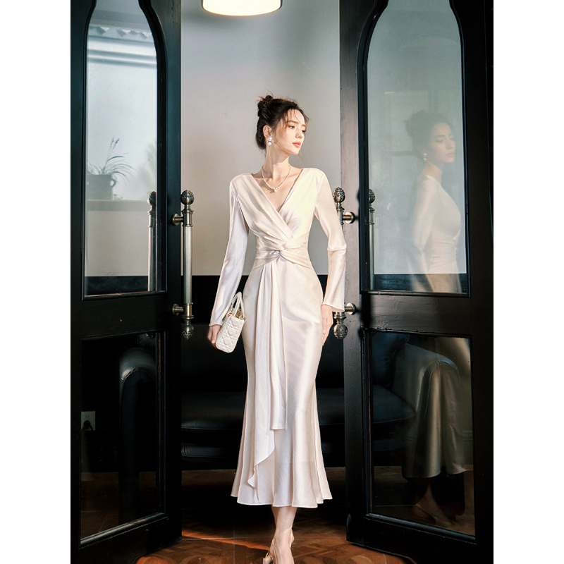 【谷月】法式扭结缎面高级连衣裙长袖生日白色气质鱼尾礼服