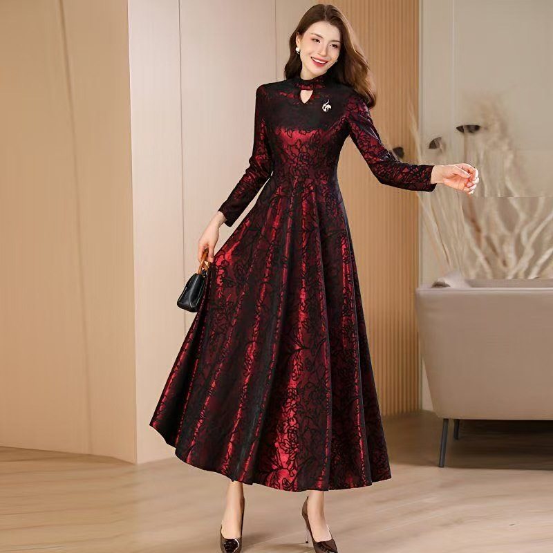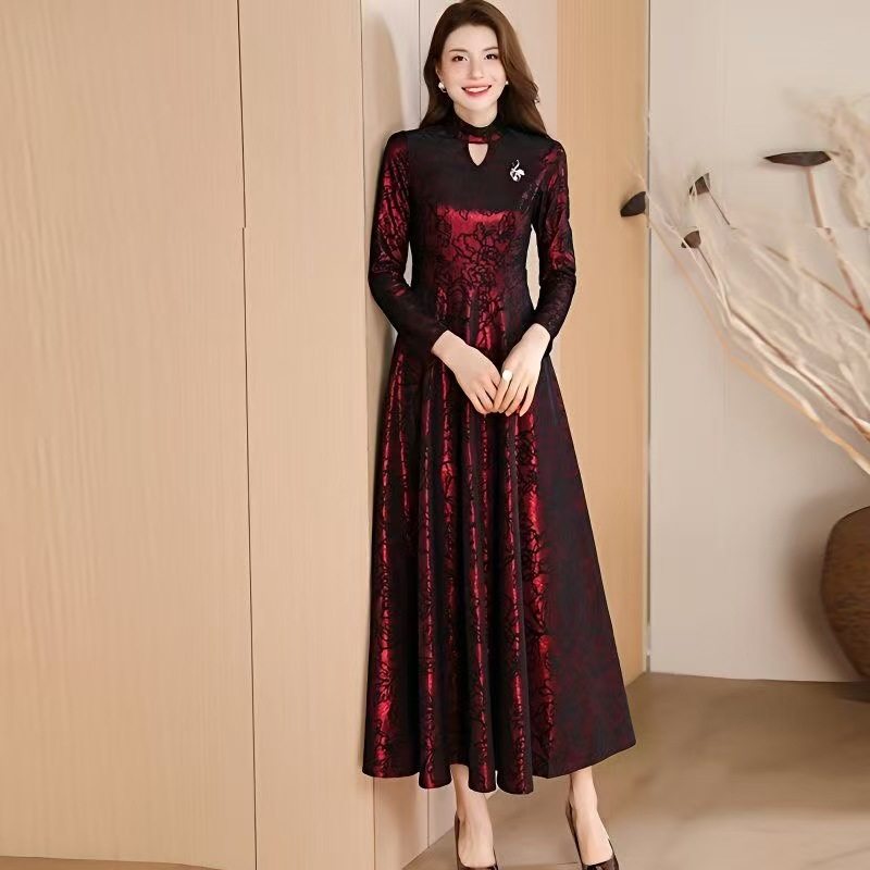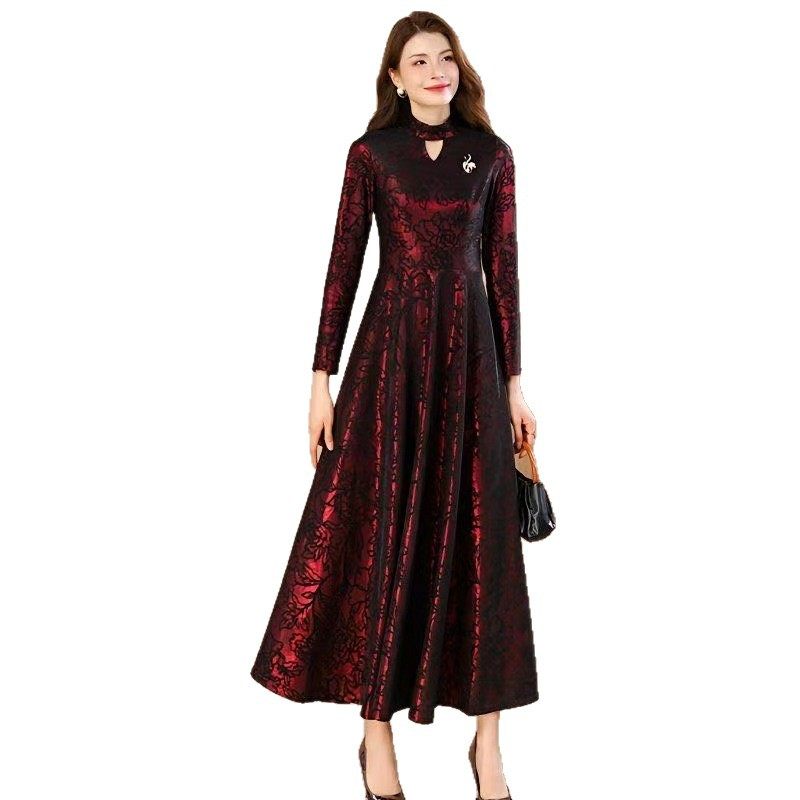 春秋新款长袖连衣裙女刺绣长款过膝高腰大摆裙气质大码到脚踝长裙