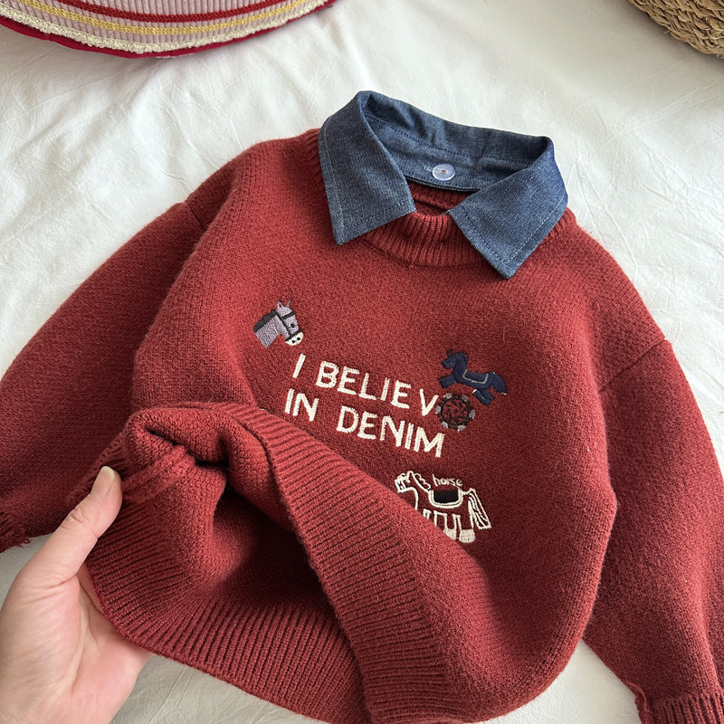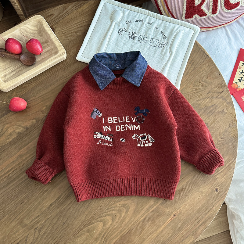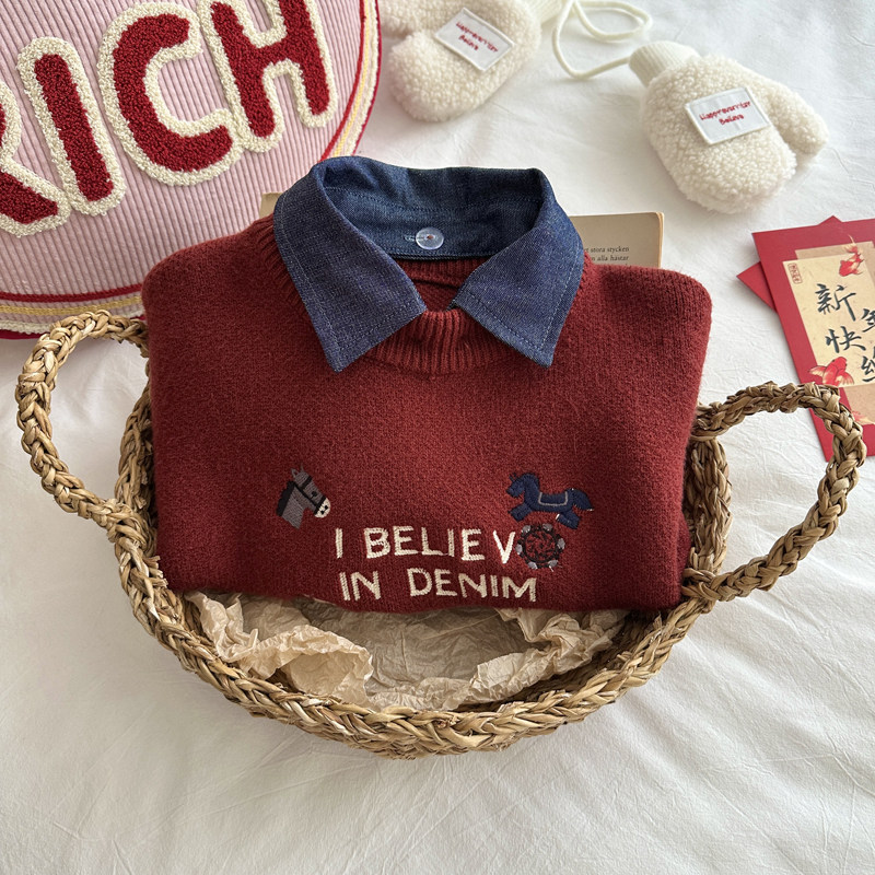 男童红色拜年服毛衣喜庆儿童加厚内搭针织衫中小童新年秋冬毛线衣