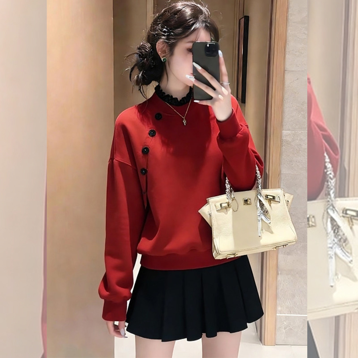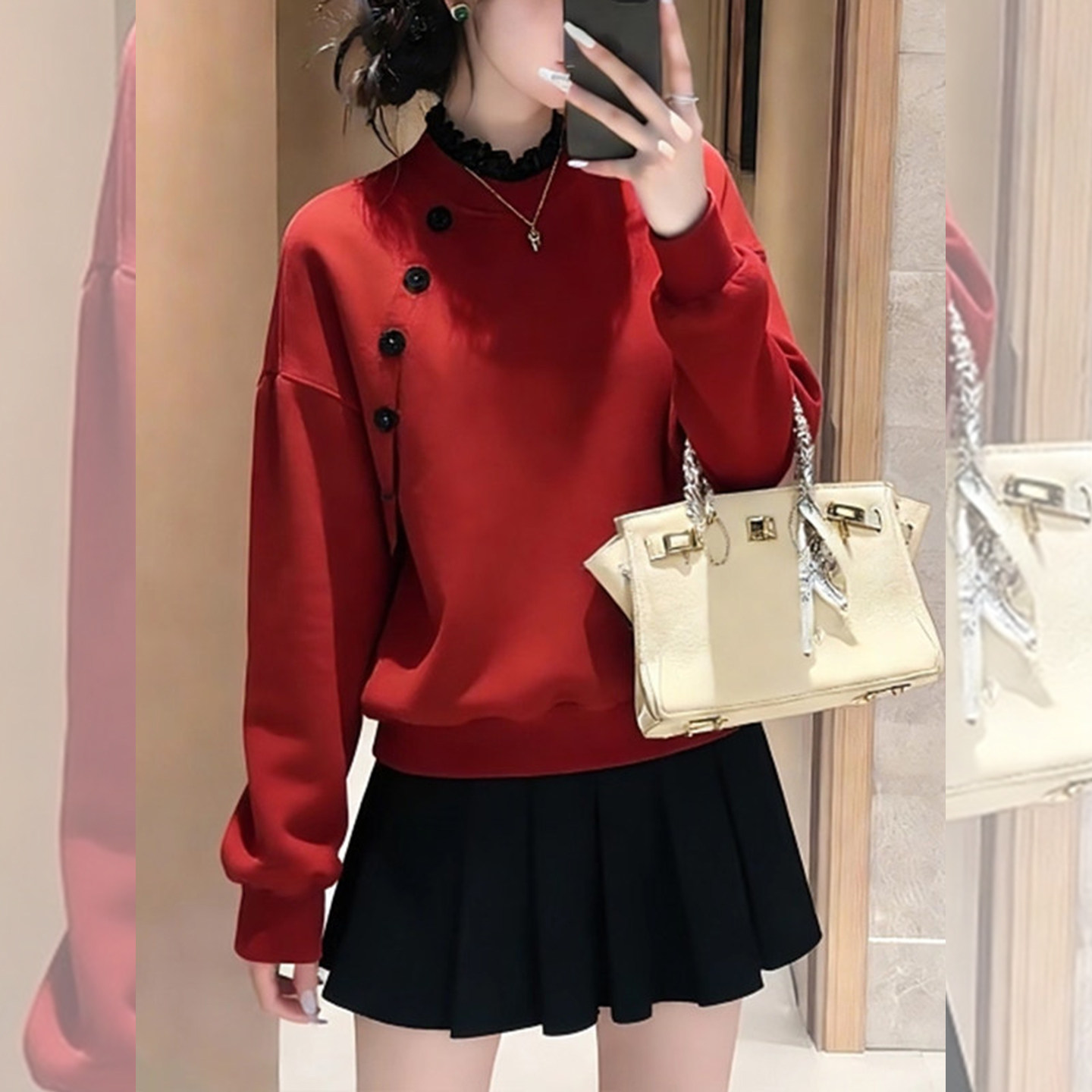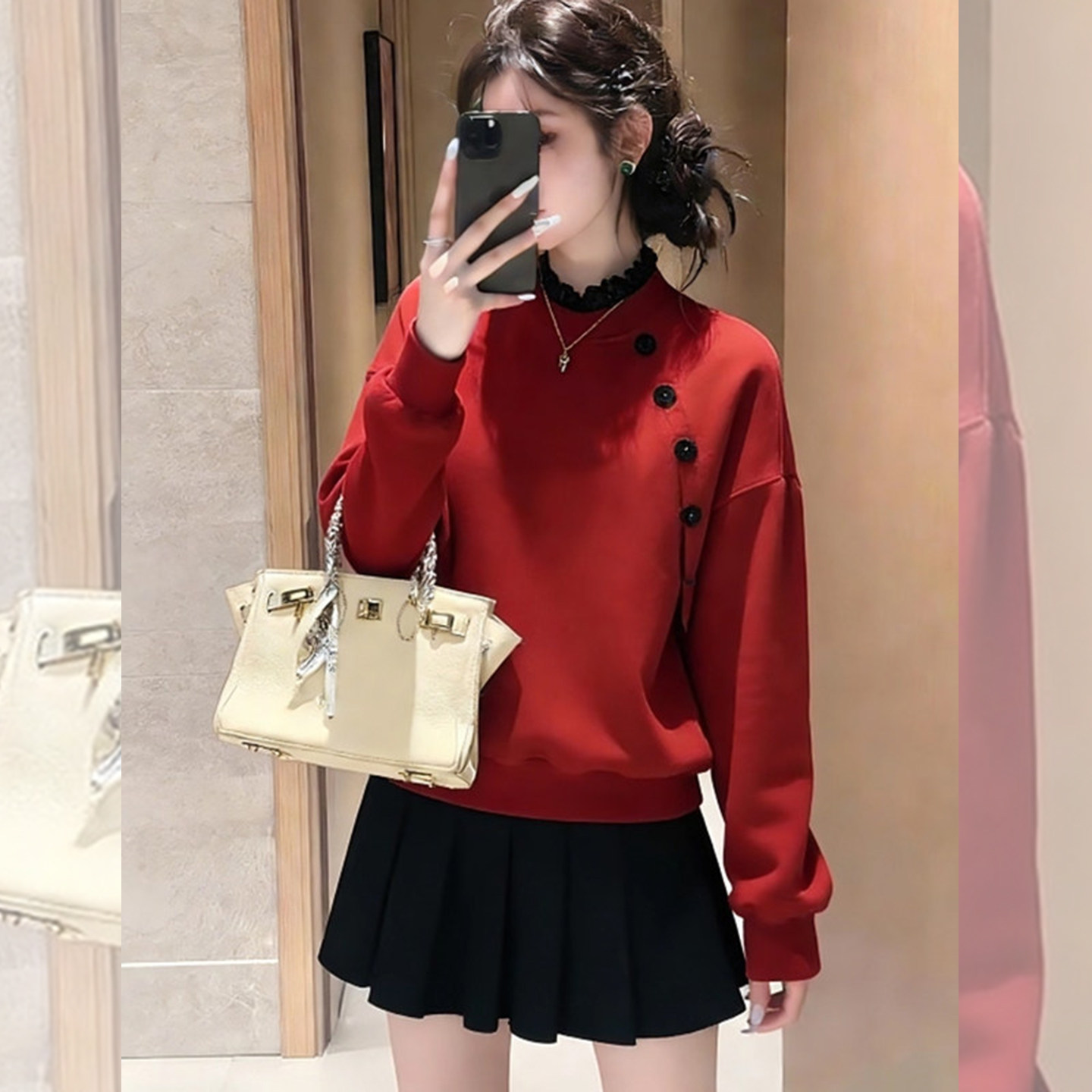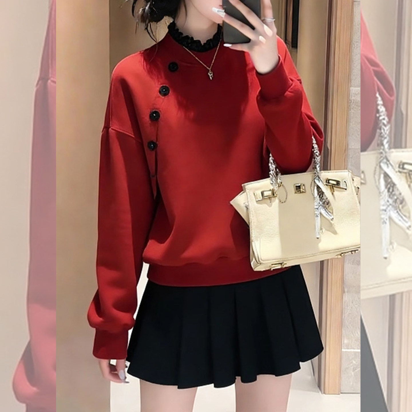 精致细节~红色木耳领无帽卫衣女款2026新款斜扣装饰显瘦减龄上衣