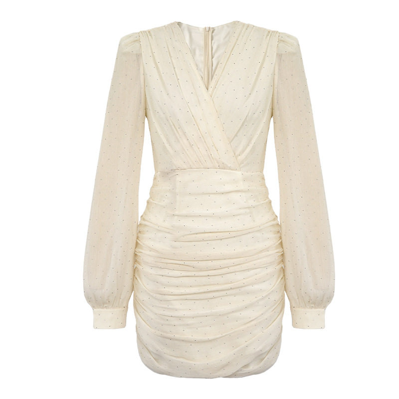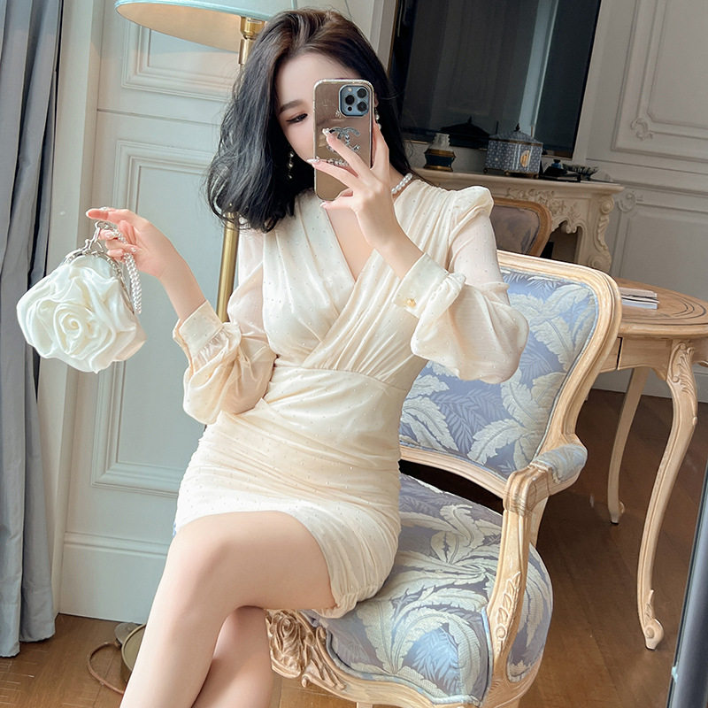 2026新款法式V领显瘦连衣裙小个子女士时尚褶皱设计感春秋包臀裙
