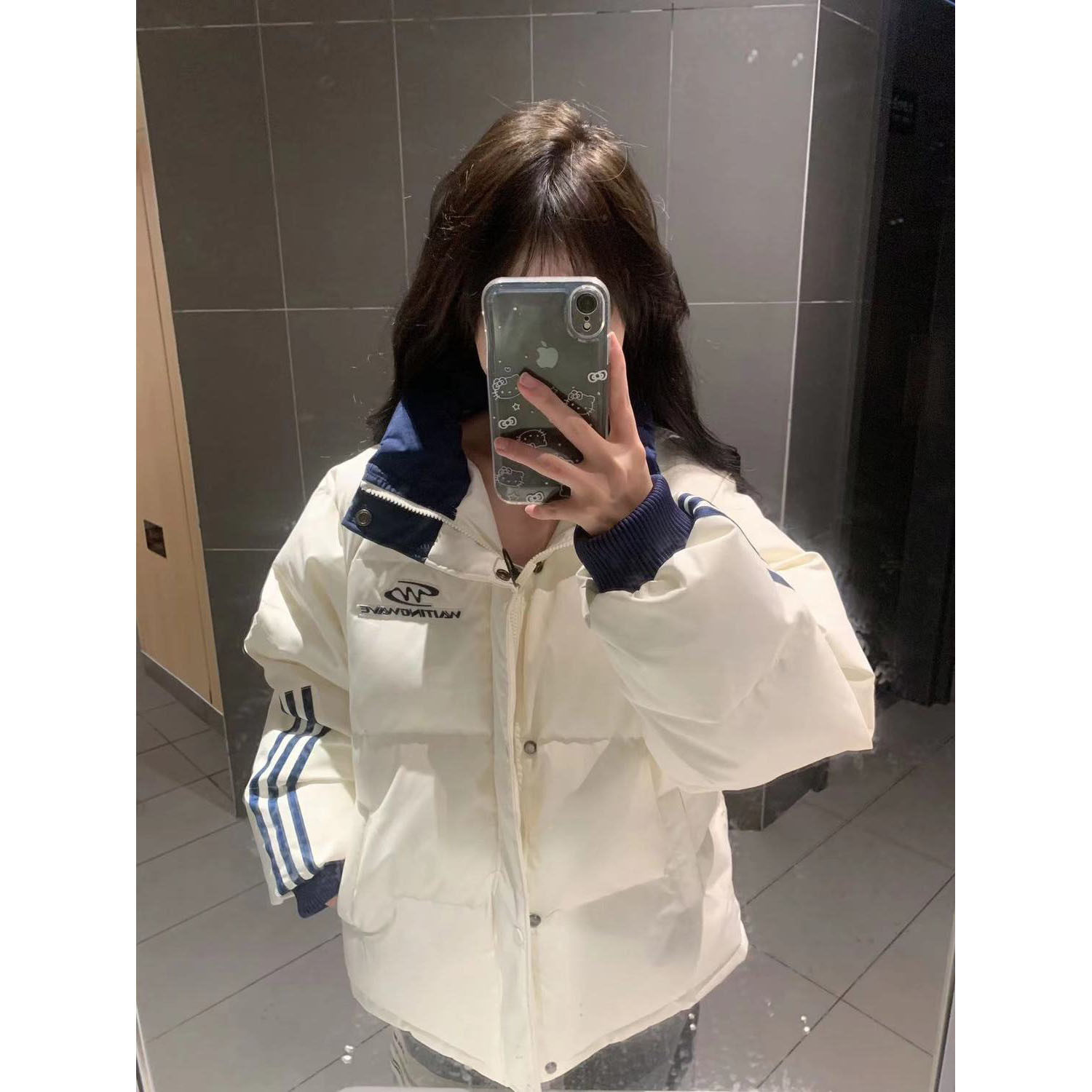 浅杏色拼接撞色条纹三杠立领棉服女冬季新款保暖宽松百搭学生外套