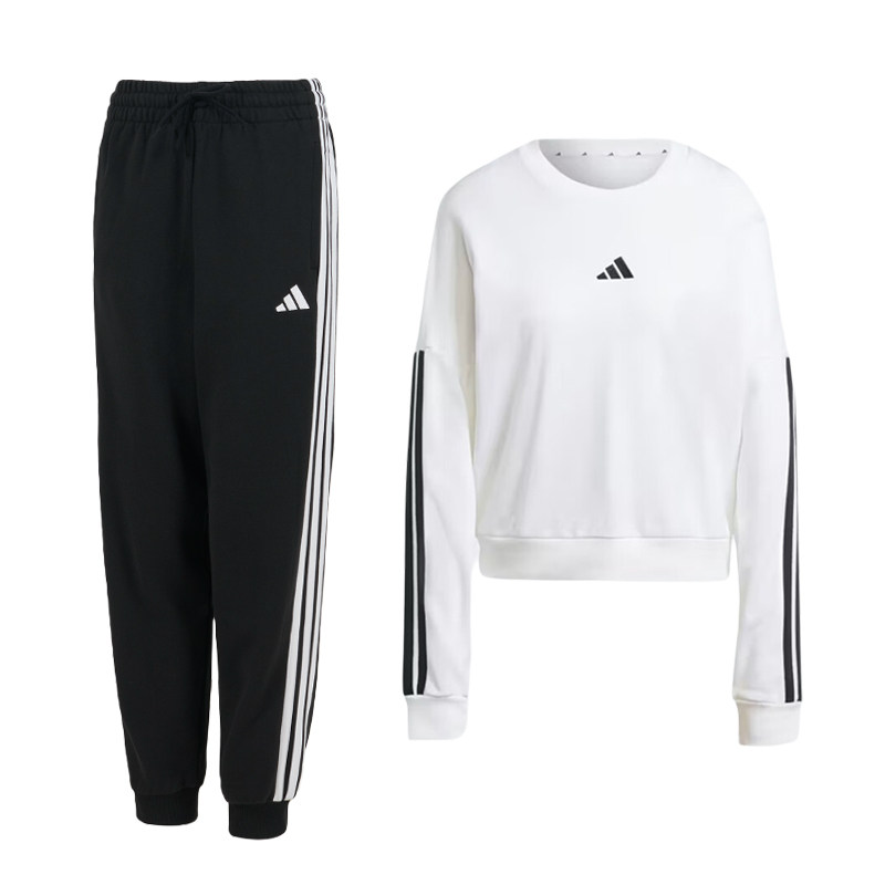 阿迪达斯女款针织套装圆领长袖卫衣三条纹束脚裤冬季运动套装女装