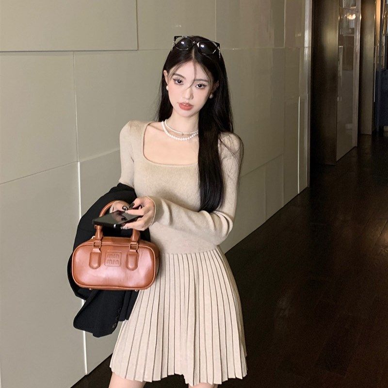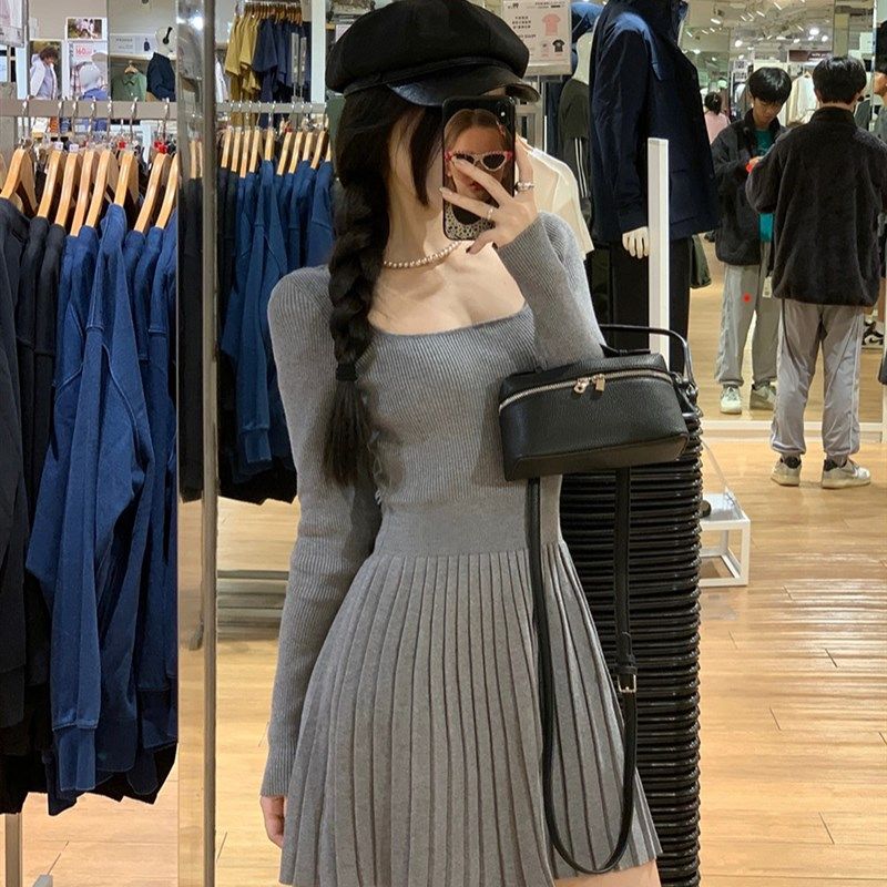 黑色长袖针织连衣裙女秋冬季新款法式气质方领收腰显瘦百褶短裙子