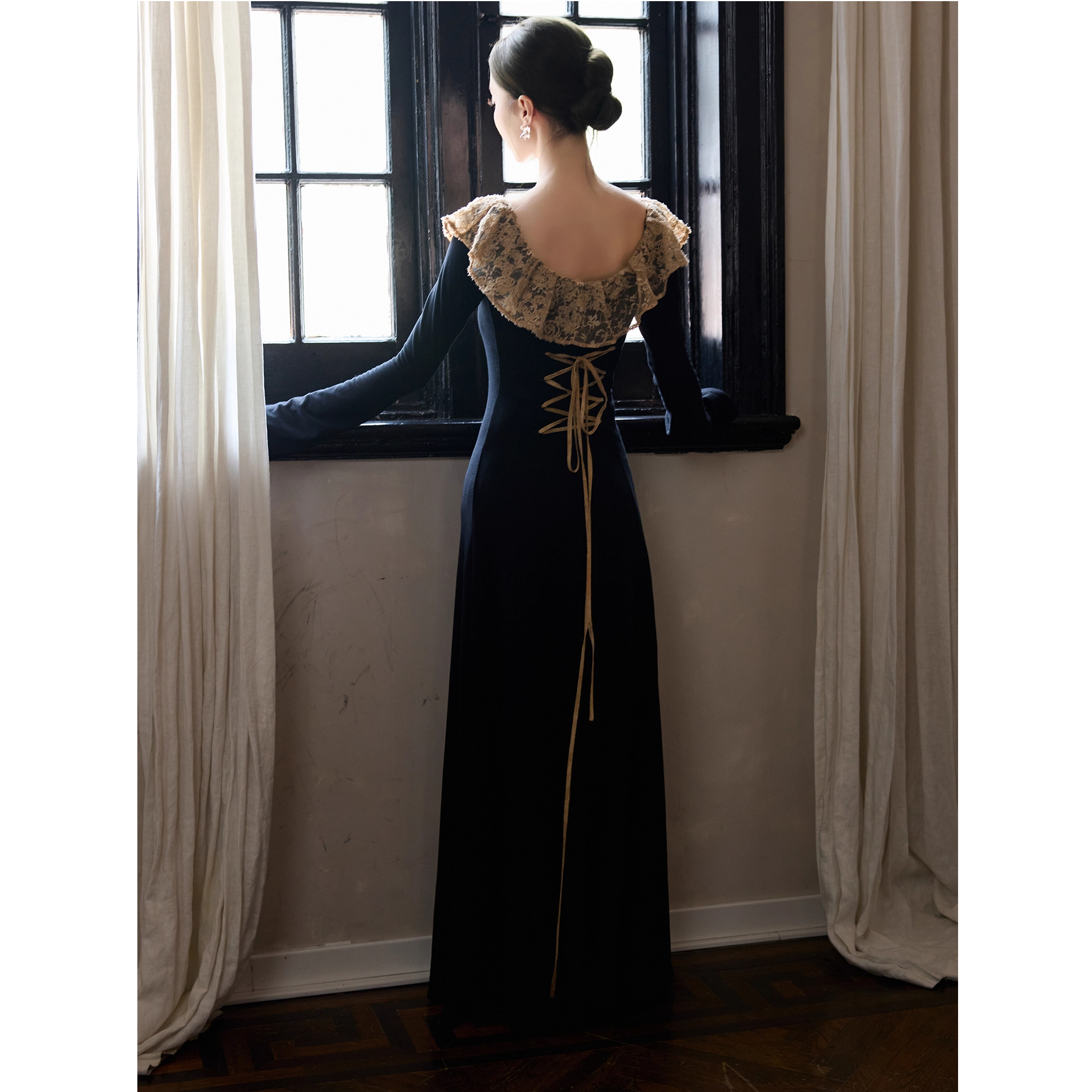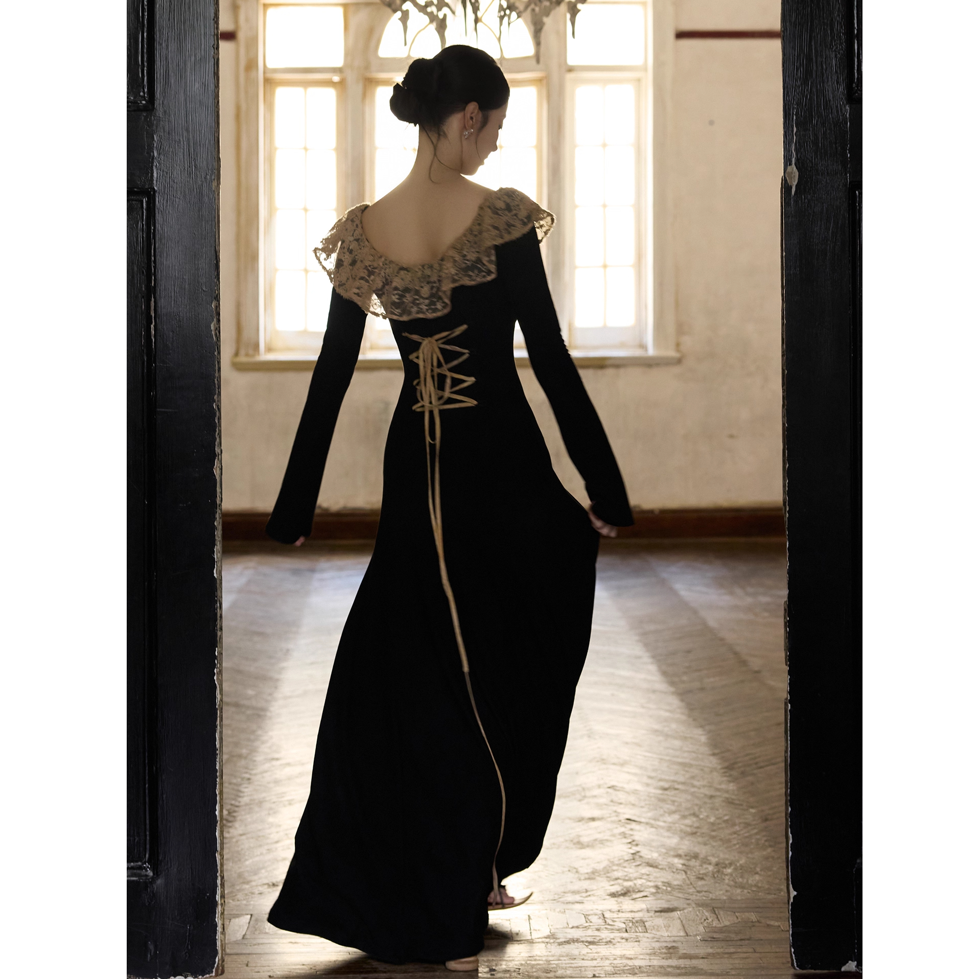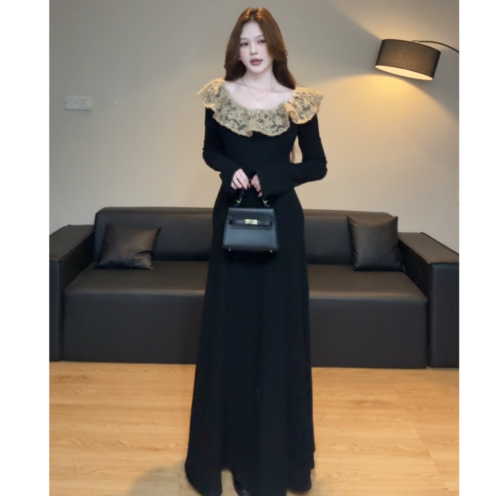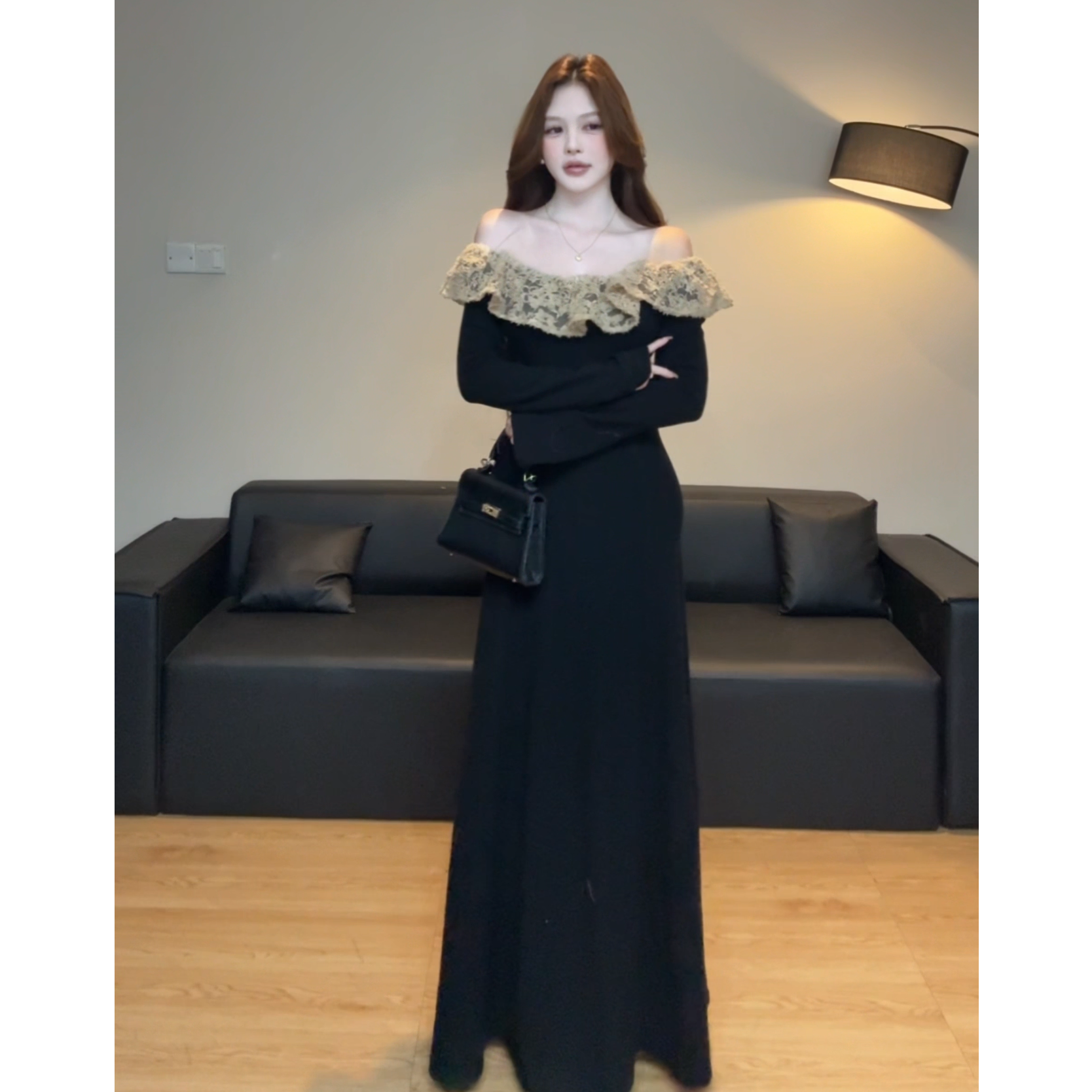 原版面料法式赫本风黑色长袖针织连衣裙 2025秋冬蕾丝拼接长裙