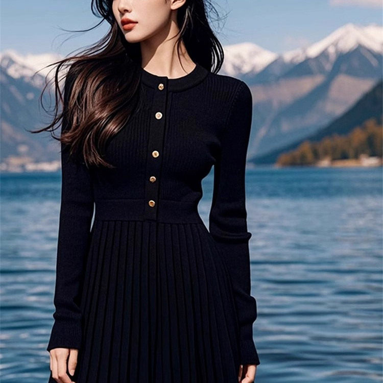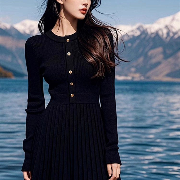 黑色长袖针织连衣裙秋冬新款气质收腰单排扣设计拼接百褶A字短裙