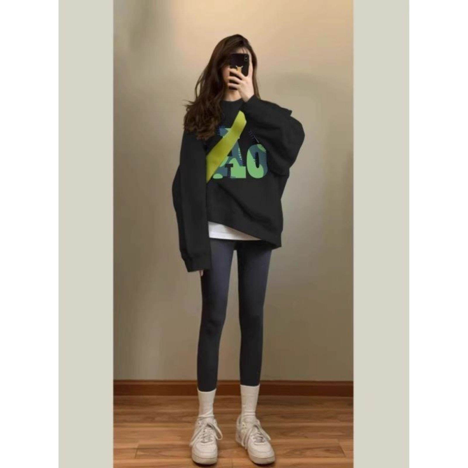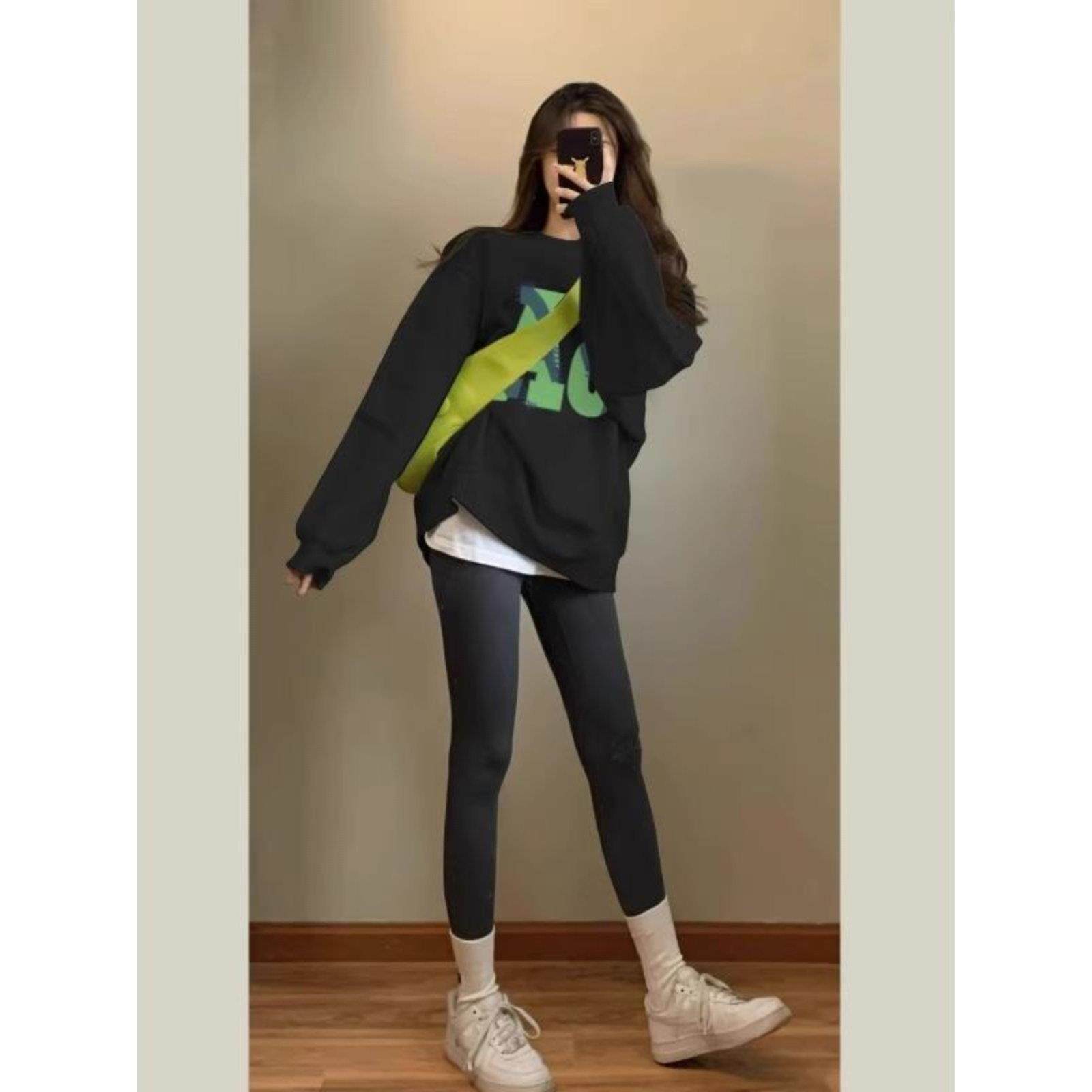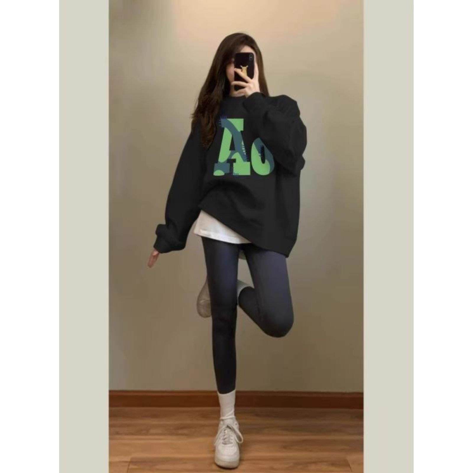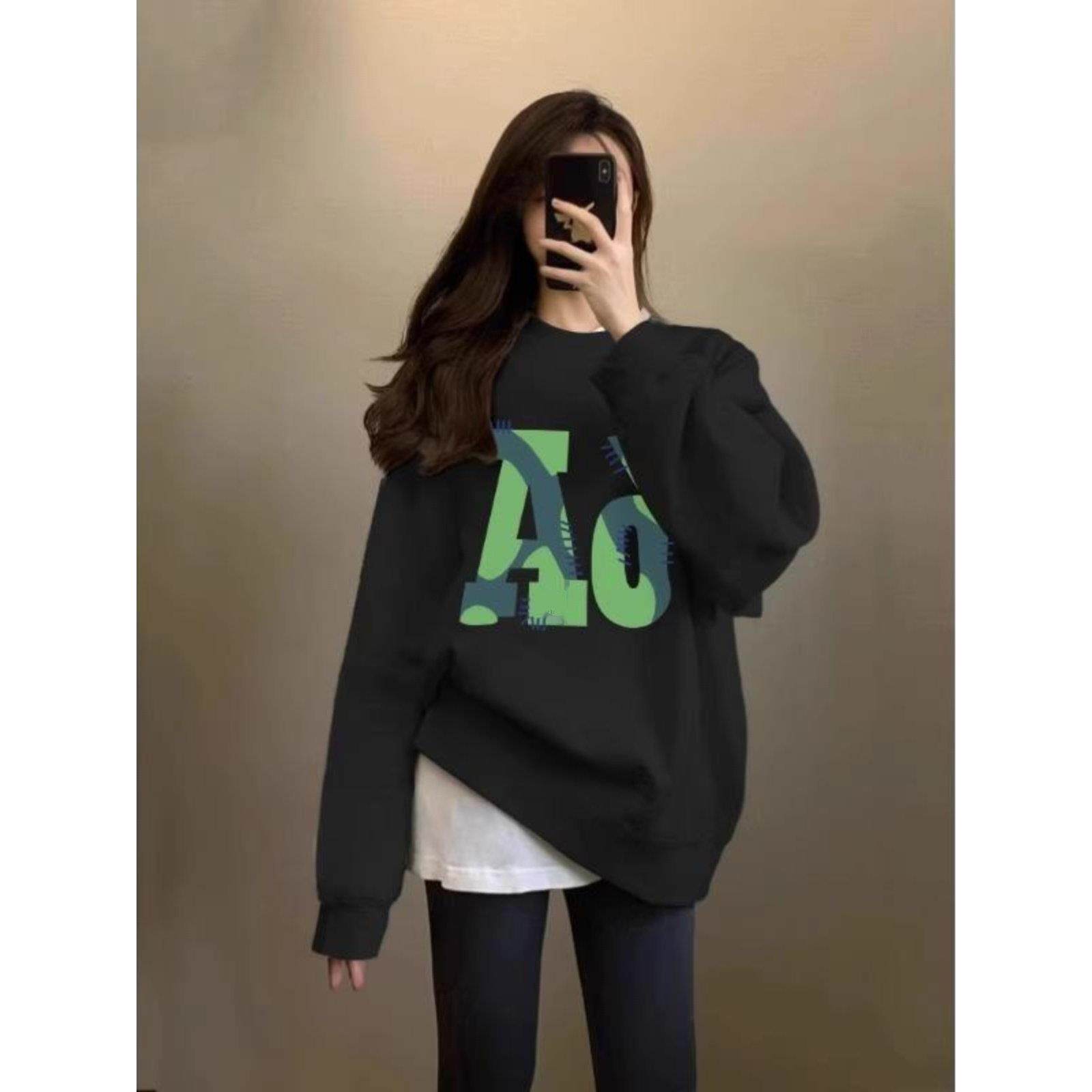 黑色圆领印花套头卫衣女2025秋季穿搭中长款加绒搭配瑜伽裤的上衣