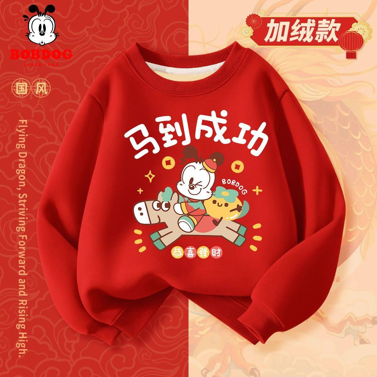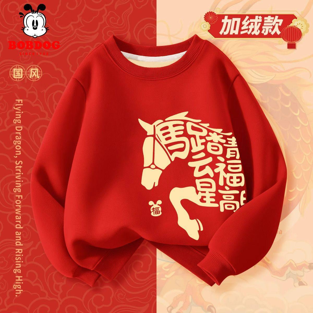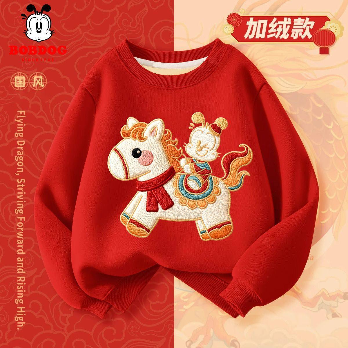 巴布豆男童过年服2026男孩加绒卫衣儿童拜年服新年中国风刺绣薄款