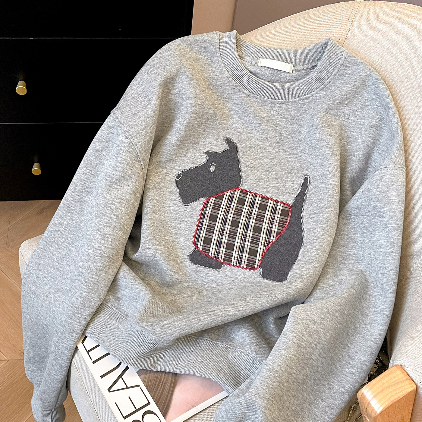 小C家 贴布刺绣小狗卫衣女款2026新款春韩系穿搭无帽圆领宽松上衣