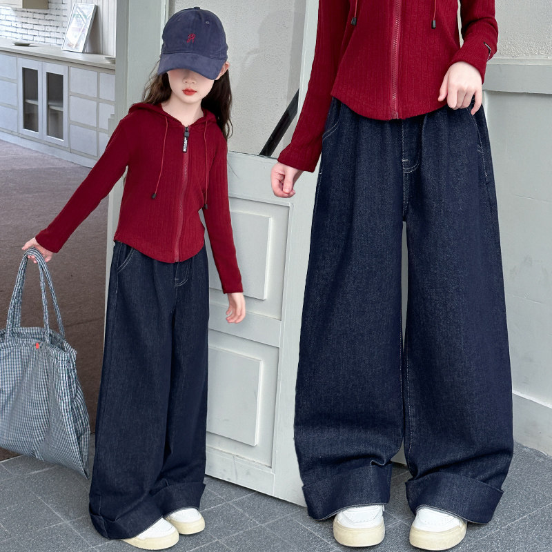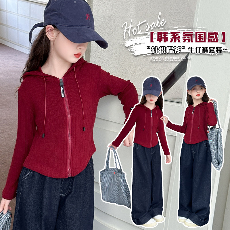 女童套装2026春秋新款中大童韩版连帽外套女孩时髦洋气牛仔阔腿裤