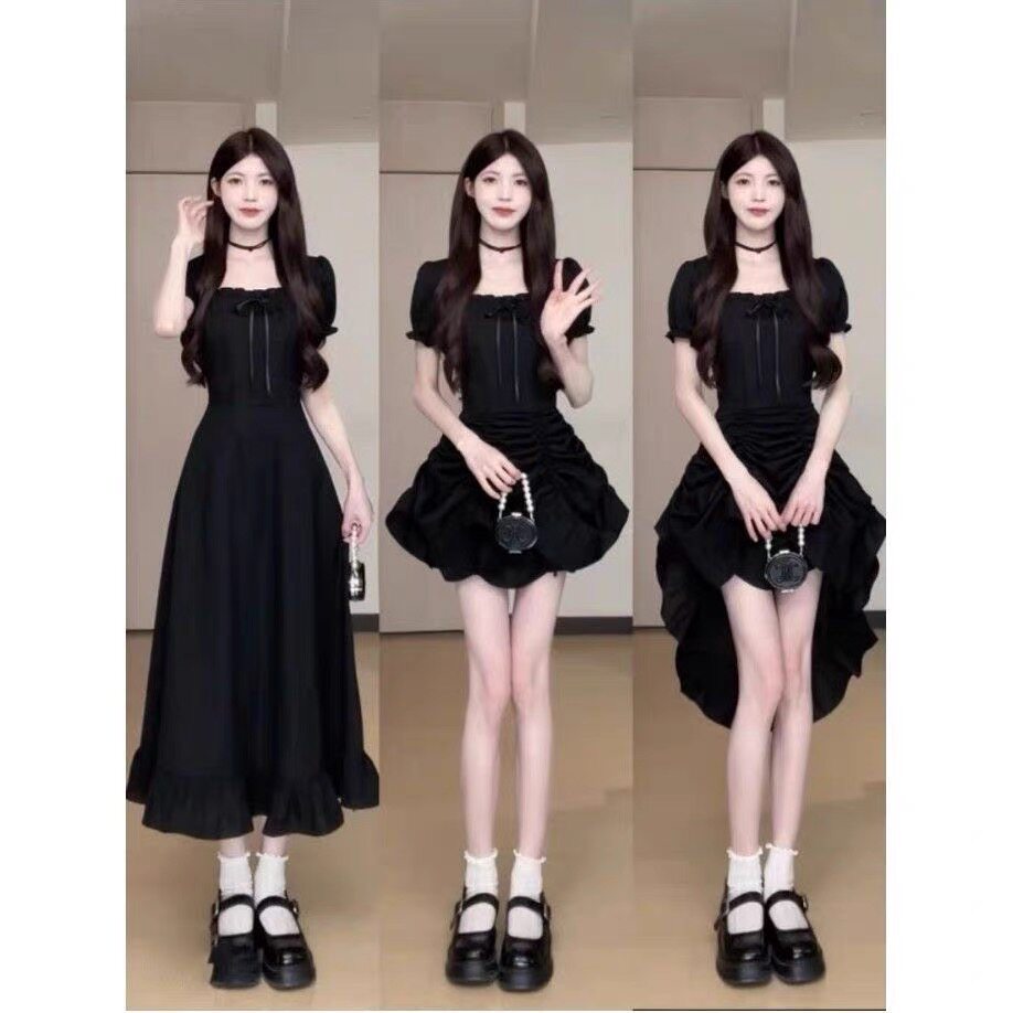 法式复古红色方领短袖连衣裙女夏季新款高级感可三穿收腰显瘦裙子