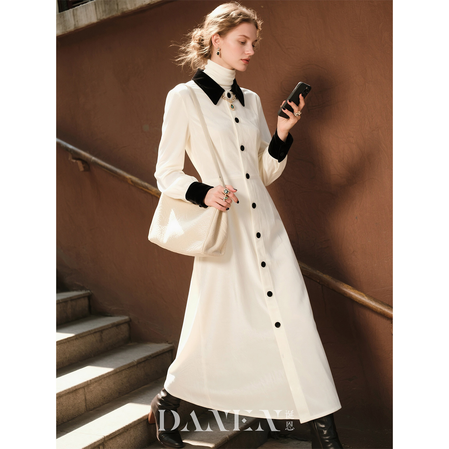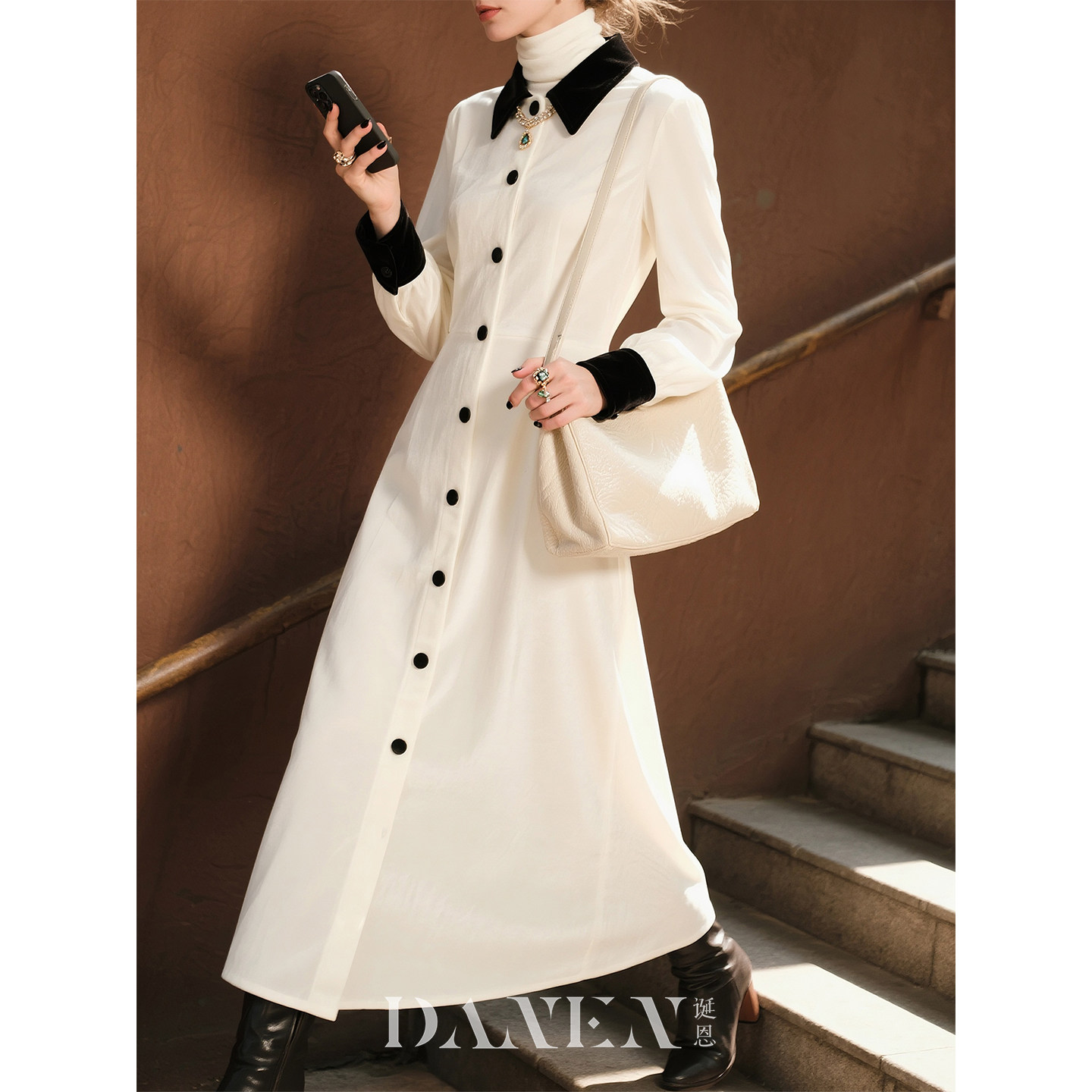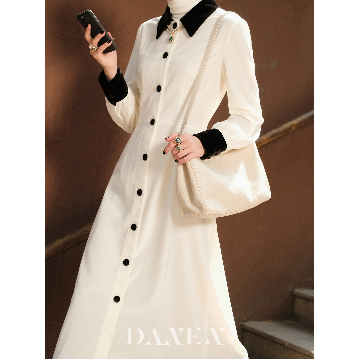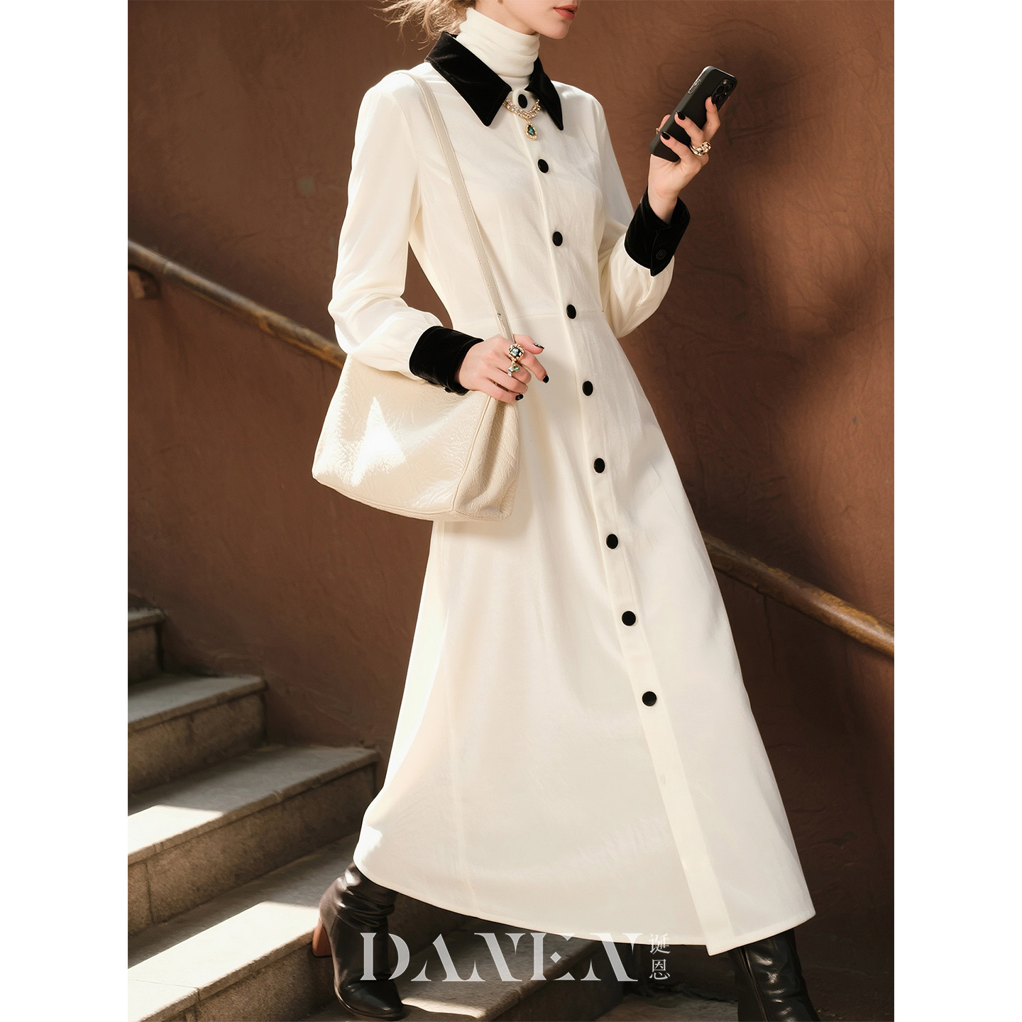 白色翻领接拼丝绒连衣裙女2026秋冬新款高级感收腰时尚气质长款裙