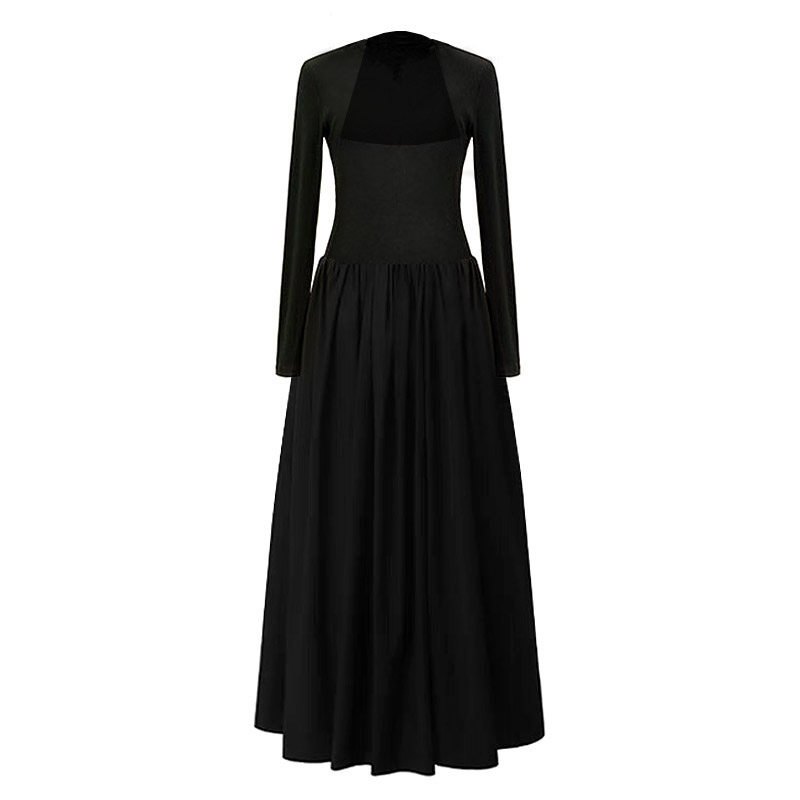 黑色方领高级感纯欲长袖挂脖假两件连衣裙女针织上衣修身长款裙子