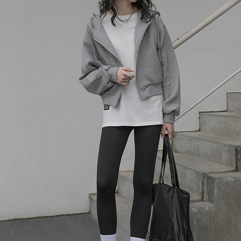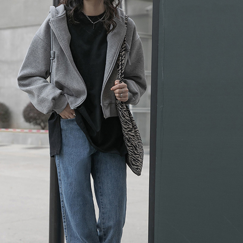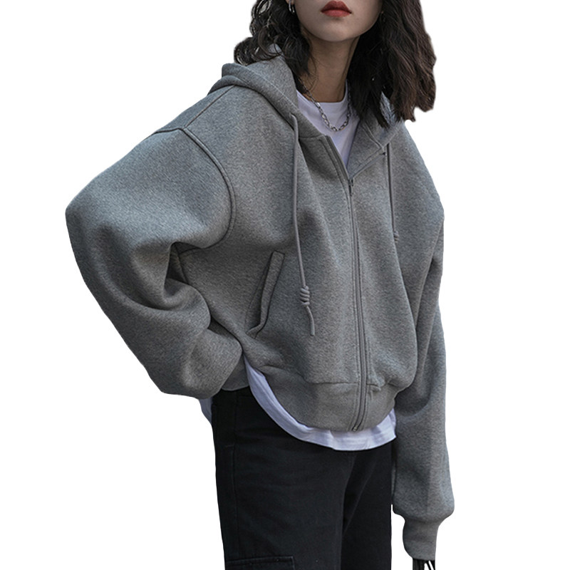 连帽短款灰色拉链卫衣外套女款秋冬新款韩系慵懒风加绒小个子上衣