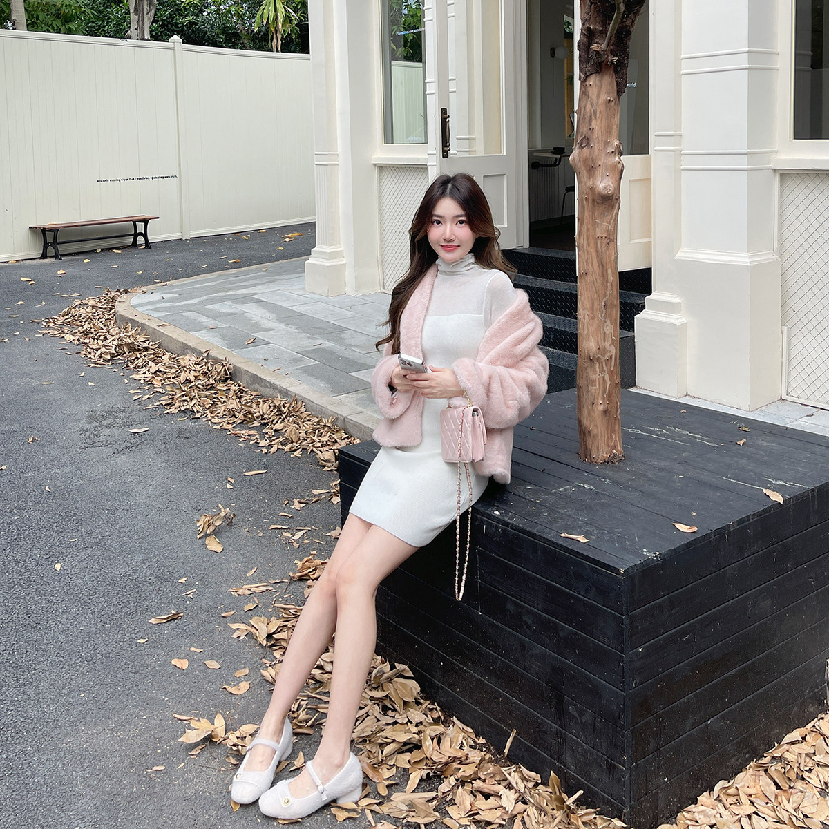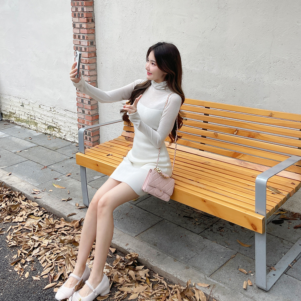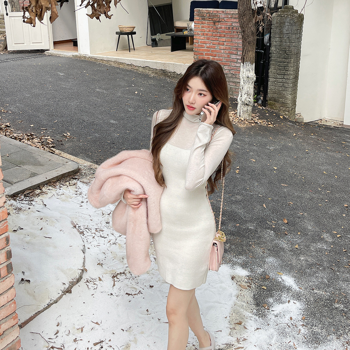 换日线_白色针织连衣裙2025秋季新款修身内搭打底收腰长袖连身裙