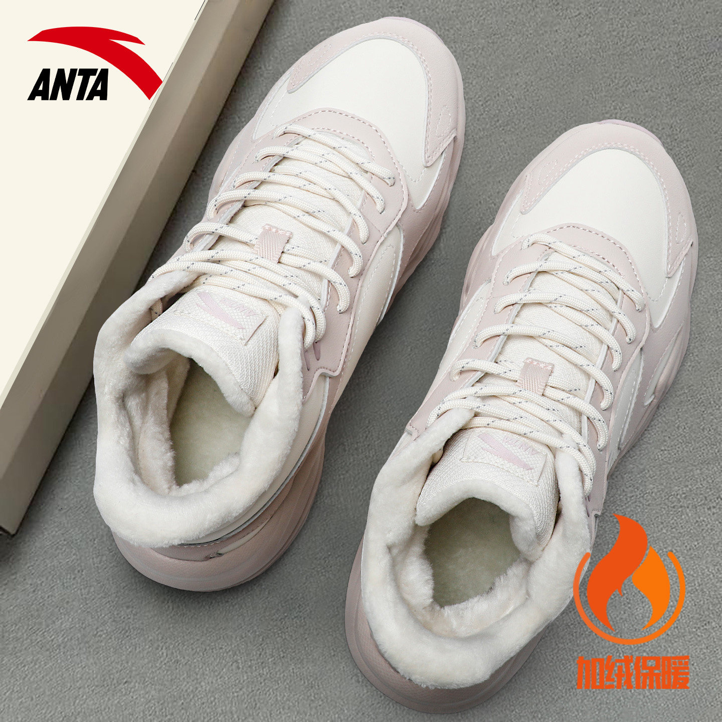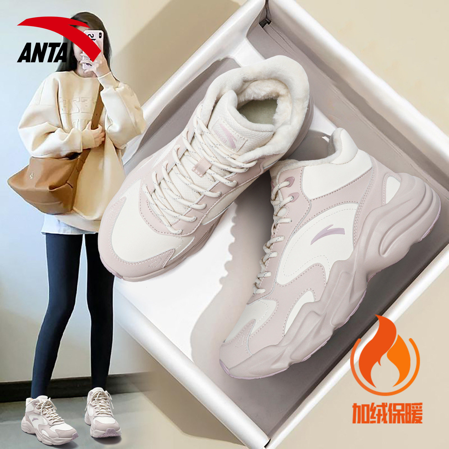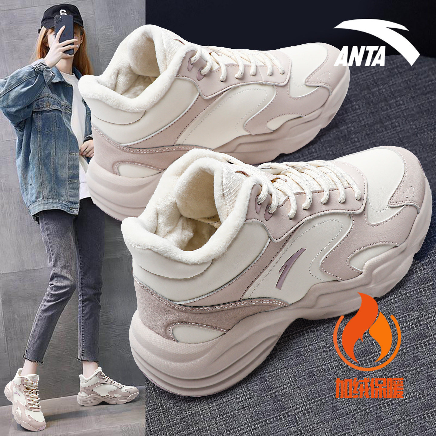 安踏加绒加厚女鞋冬季保暖棉鞋高帮皮面厚底百搭防滑休闲运动鞋子