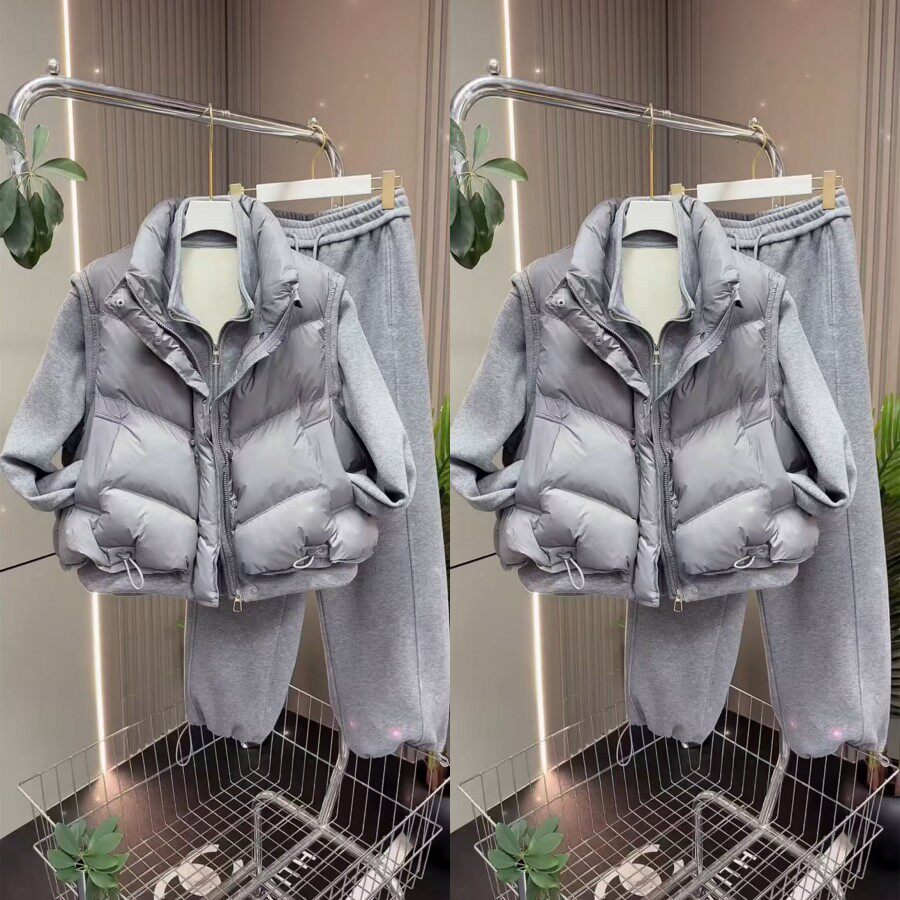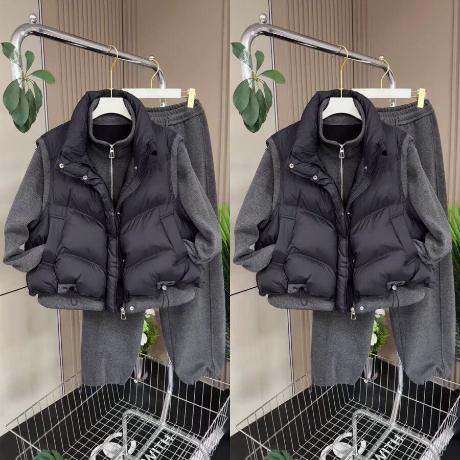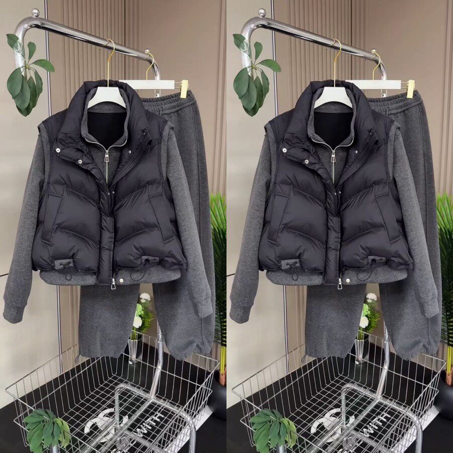 韩系简约风马夹立领外套抽绳裤脚三件套2026早春新款休闲百搭套装