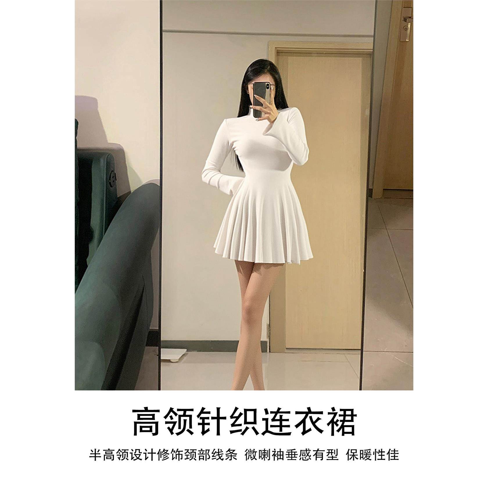 白色针织连衣裙女秋冬季加绒加厚内搭打底梨形伯克利短裙子老钱风