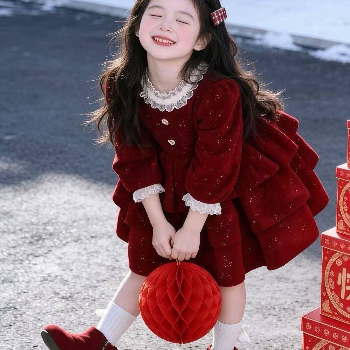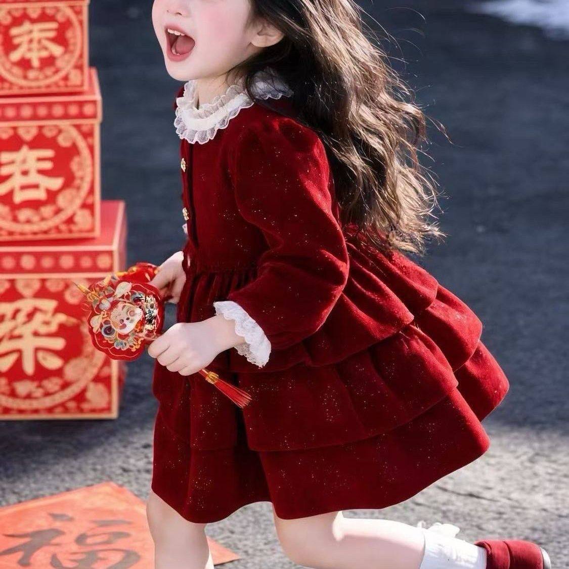 女童冬装连衣裙2026新款儿童加绒蓬蓬裙小女孩新年红色闪闪蛋糕裙