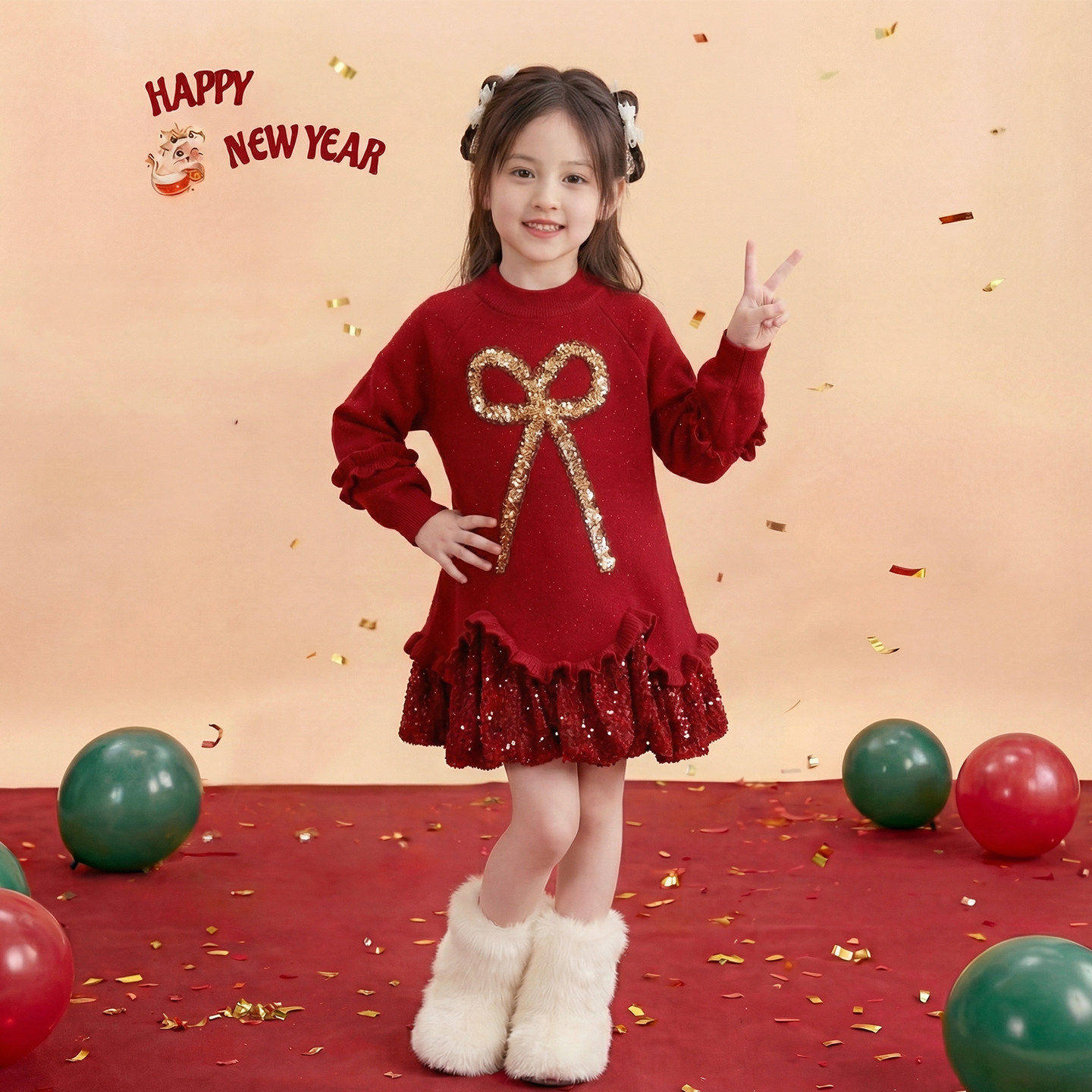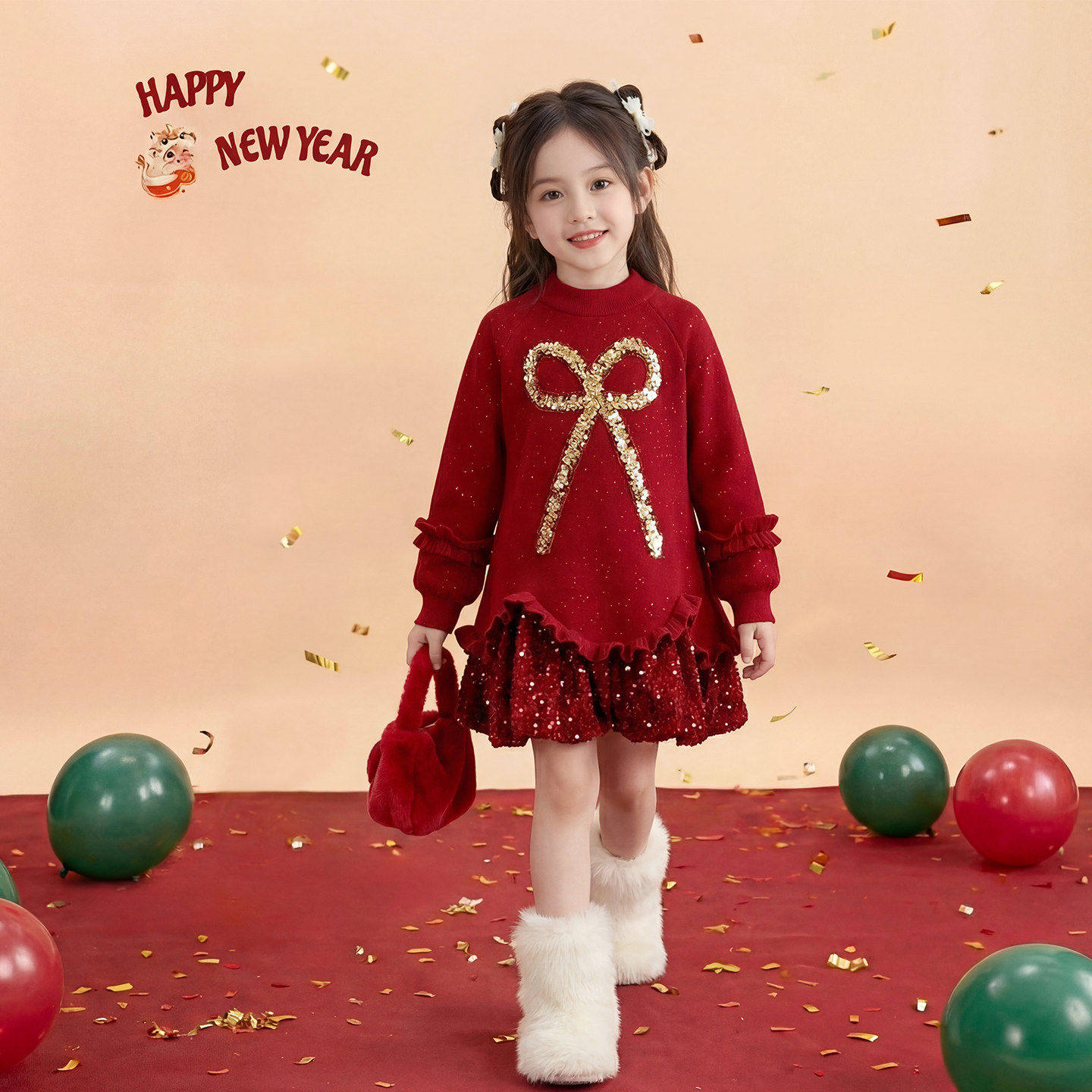 女童新年连衣裙冬装2026新款儿童加绒长袖卫衣裙中大童红色拜年裙