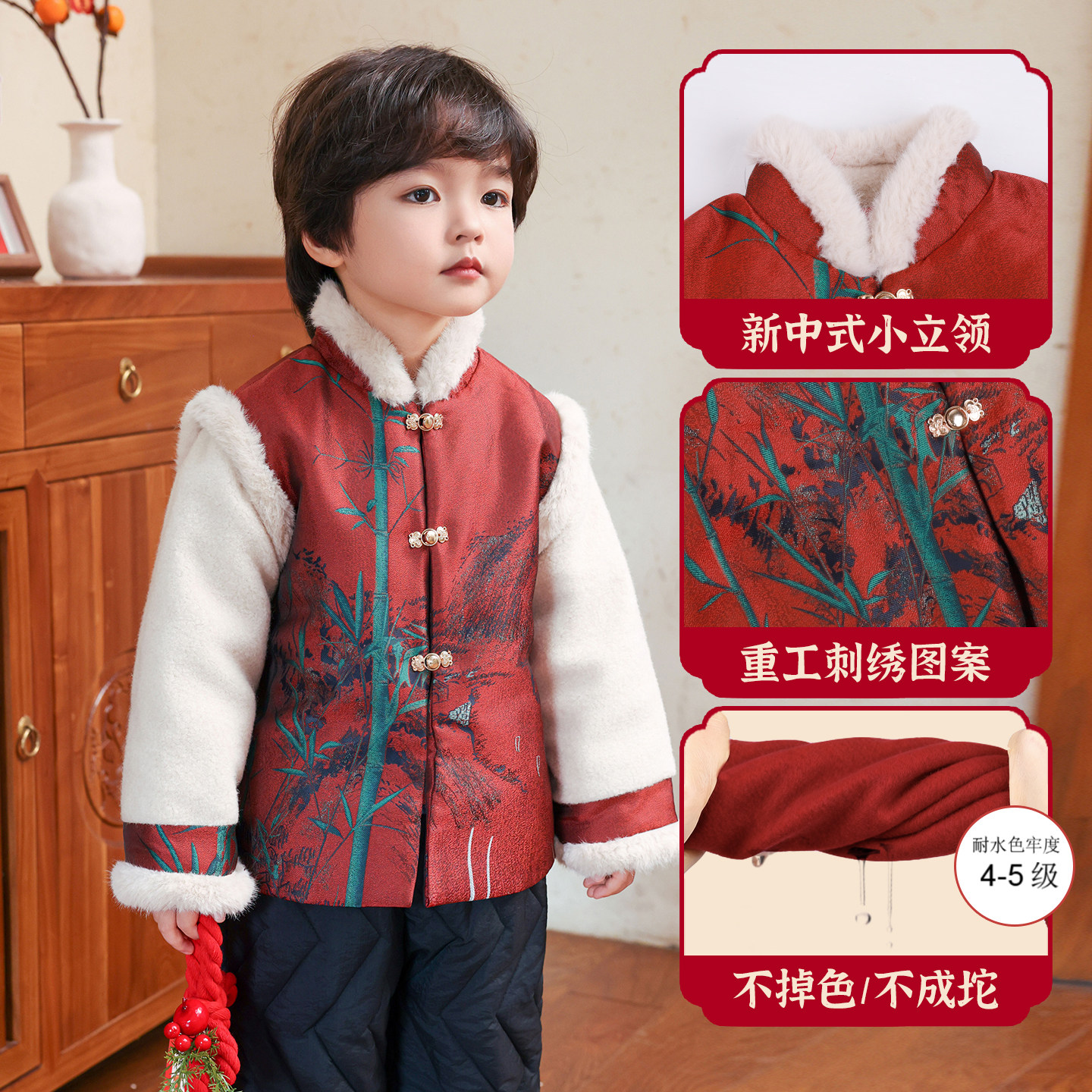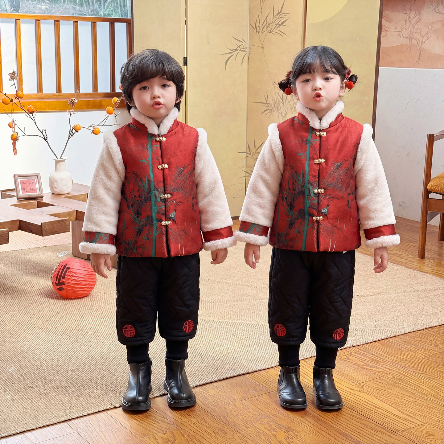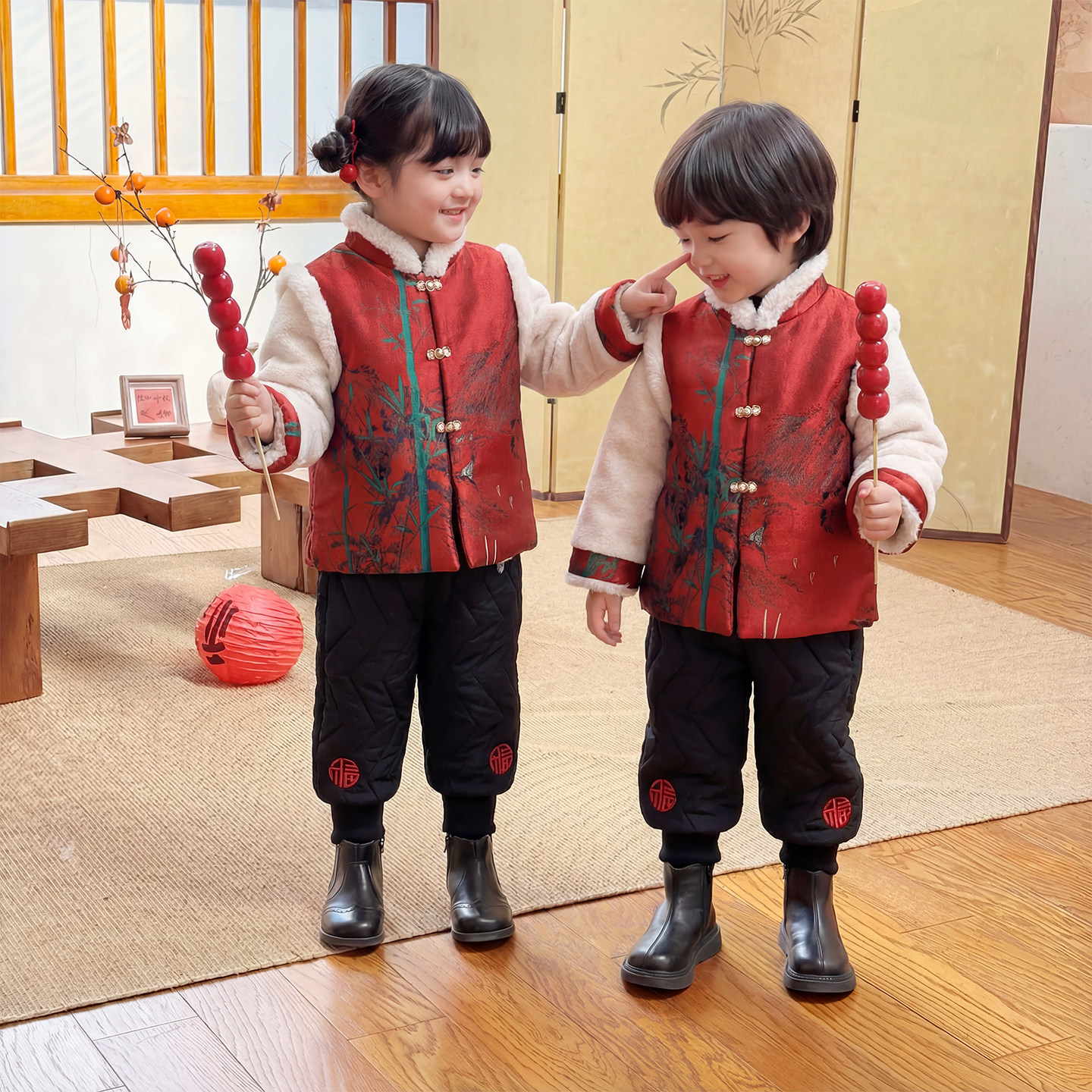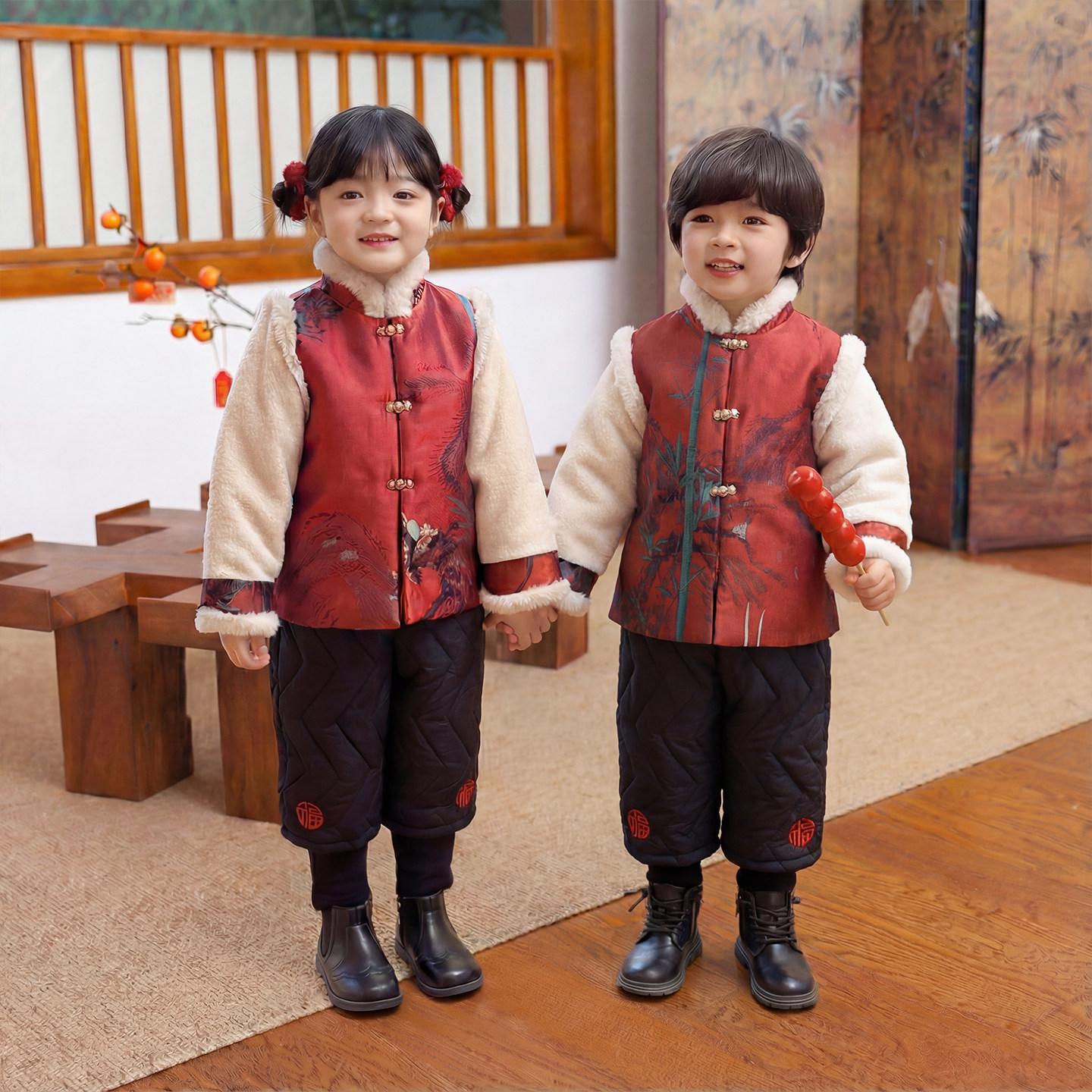 儿童拜冬年服女童过年服红色中式国风唐装男童喜庆衣服加厚姐弟装