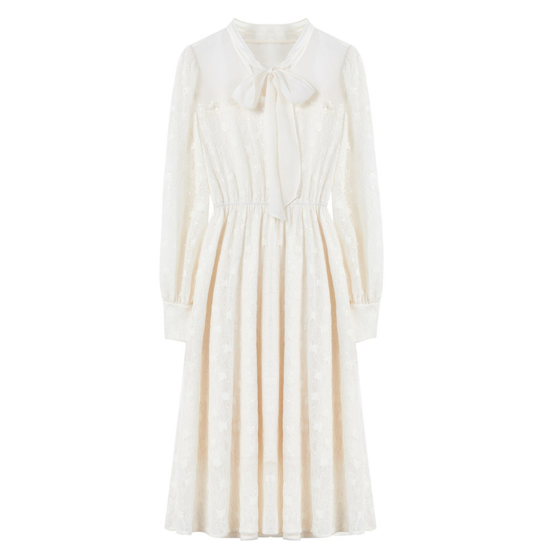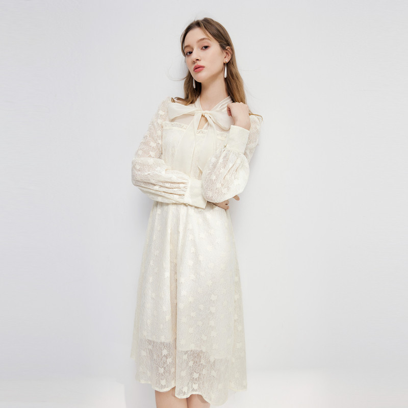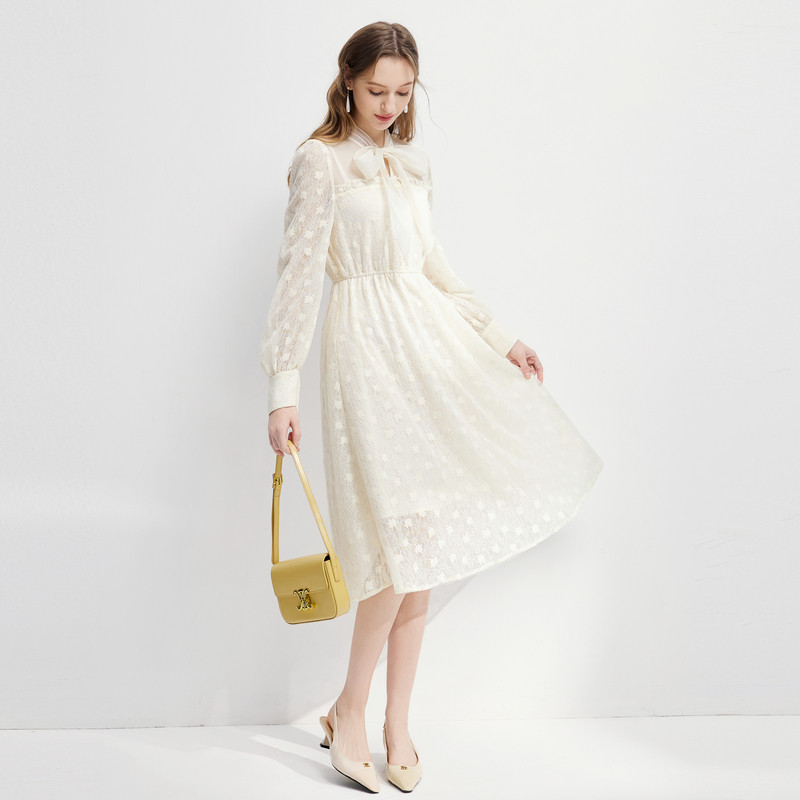 秋水伊人米白飘带领蕾丝连衣裙女2025年春季新款甜美减龄中长裙