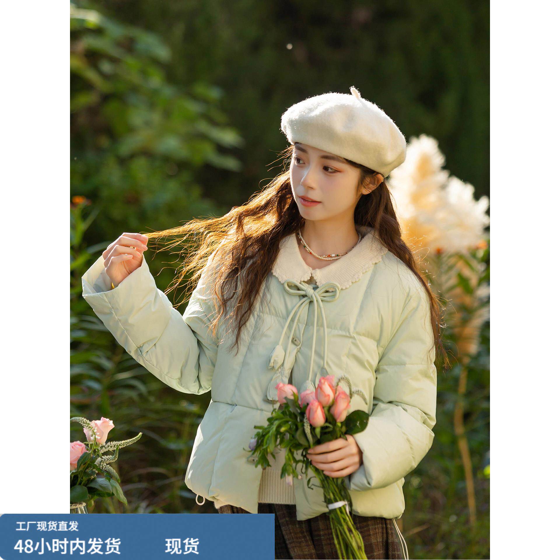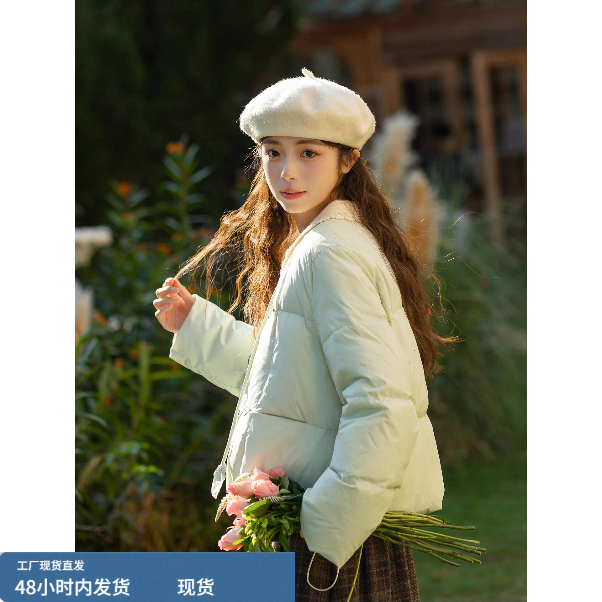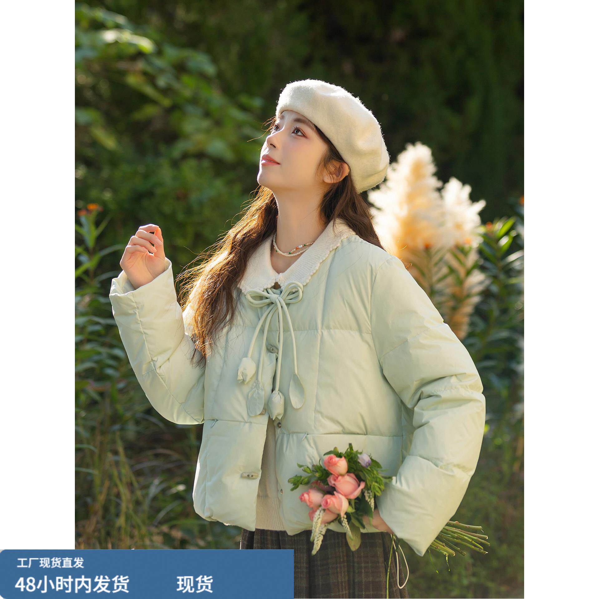 浅绿色短款圆领羽绒服女2025冬新款设计感保暖面包服外套