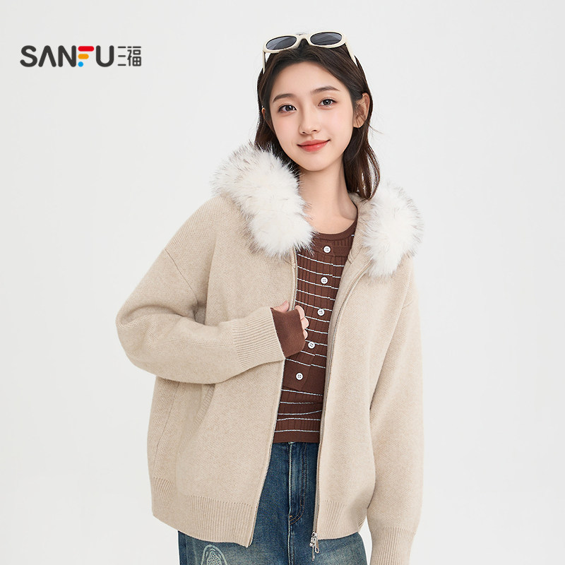 三福披肩外套女2026新款春季毛领连帽开衫宽松毛织上衣女装516788