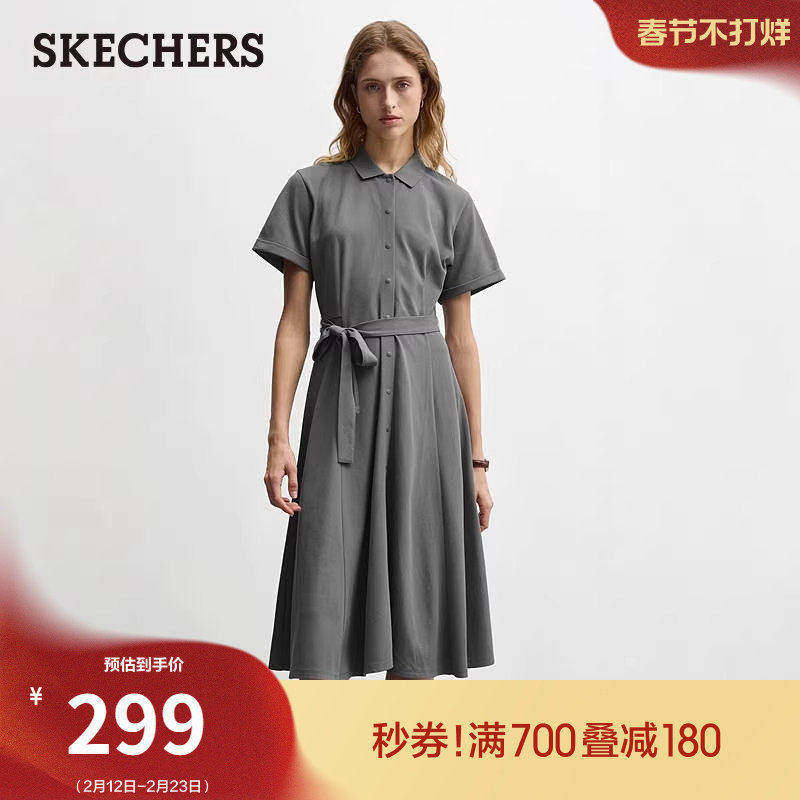 斯凯奇2026春季新款女士休闲运动针织连衣裙慵懒风腰带垂感长裙