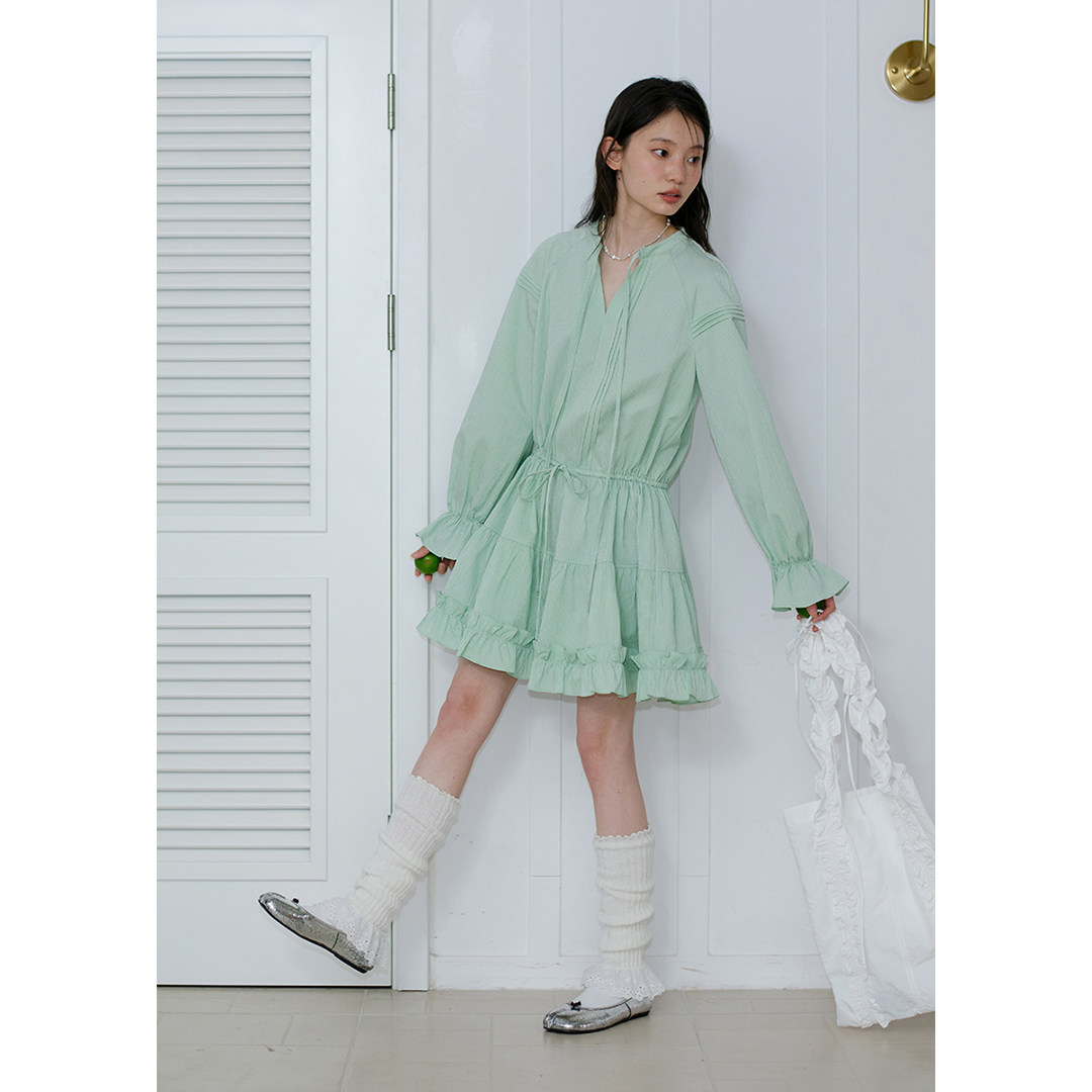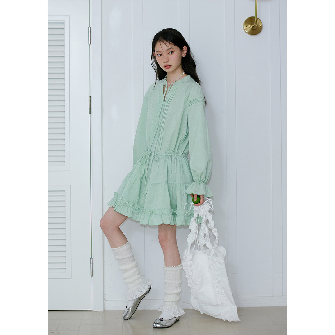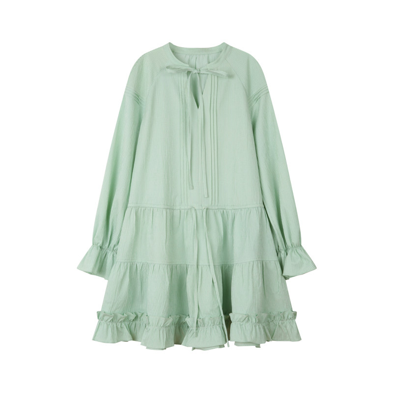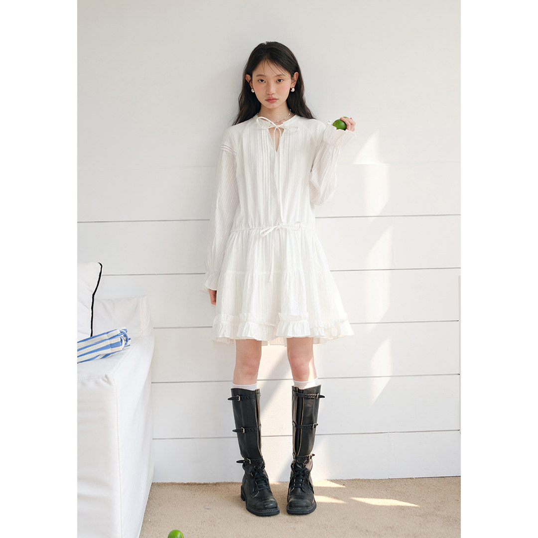 BLUEerror 收腰花边v领白色长袖连衣裙纯棉荷叶边裙子早秋长裙