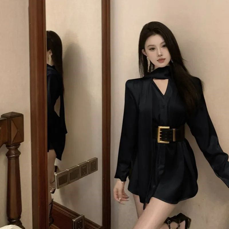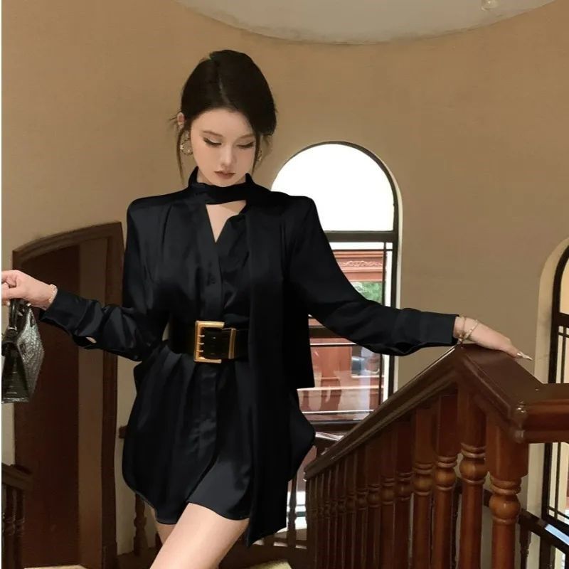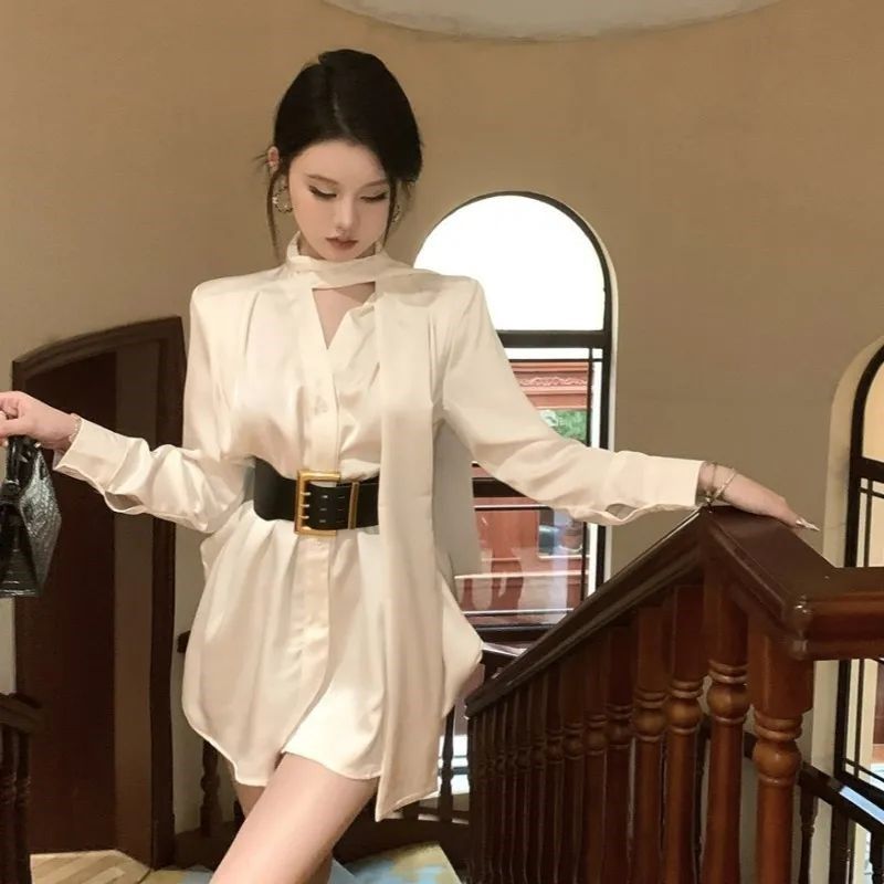 白色缎面衬衫连衣裙女秋季高级感长袖裙子御姐风气质收腰a字短裙