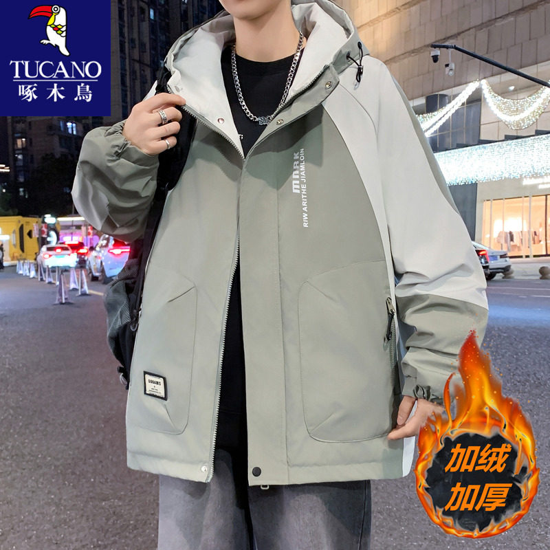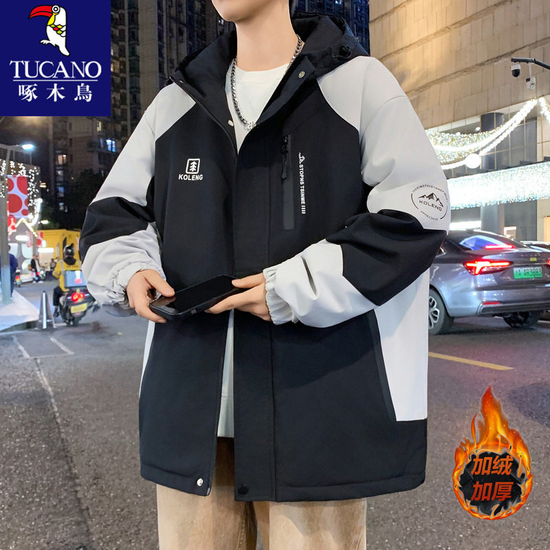 啄木鸟加绒冲锋衣夹克男款秋冬季加厚保暖外套青少年男生冬装棉服