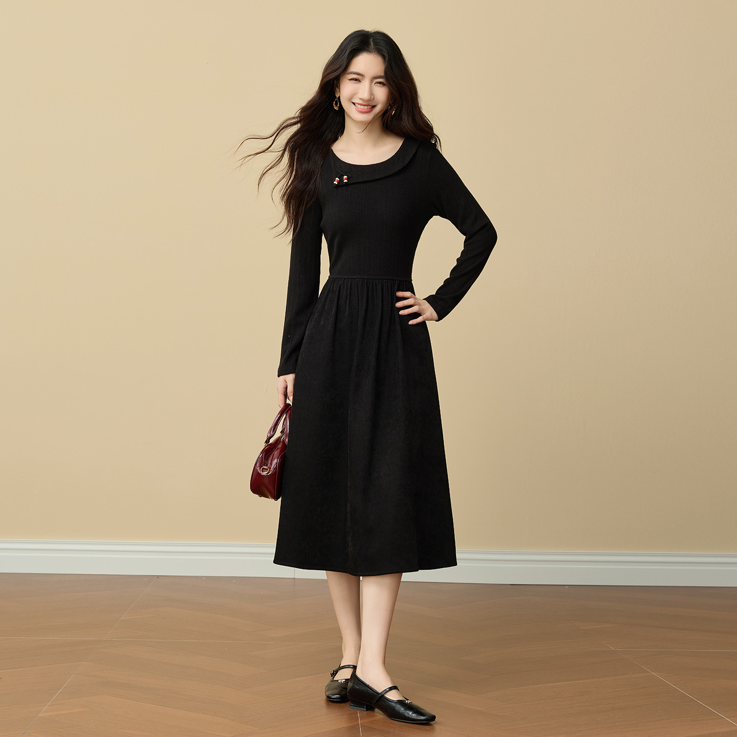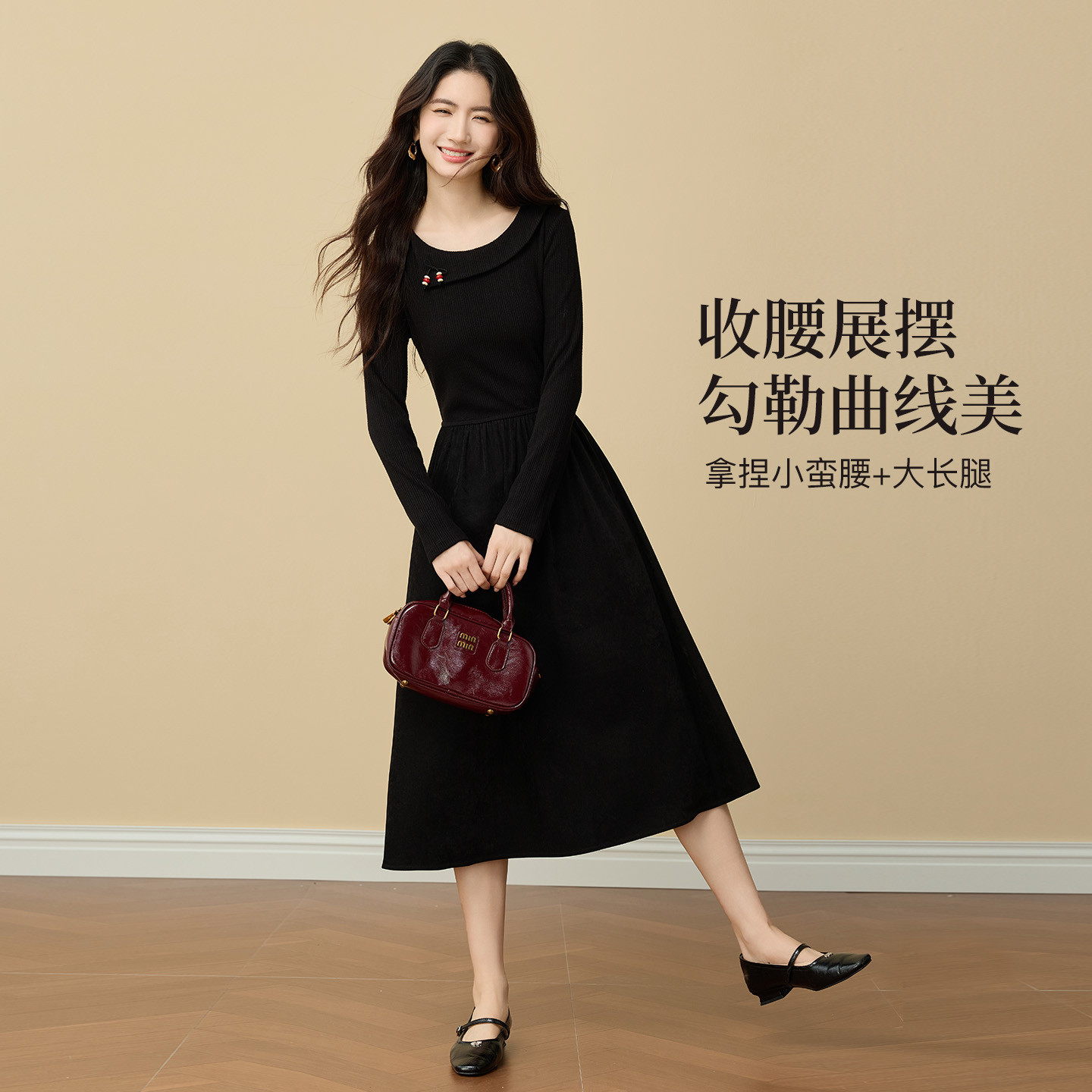 熙世界优雅赫本风黑色针织连衣裙女冬季新款法式配大衣的掐腰裙子