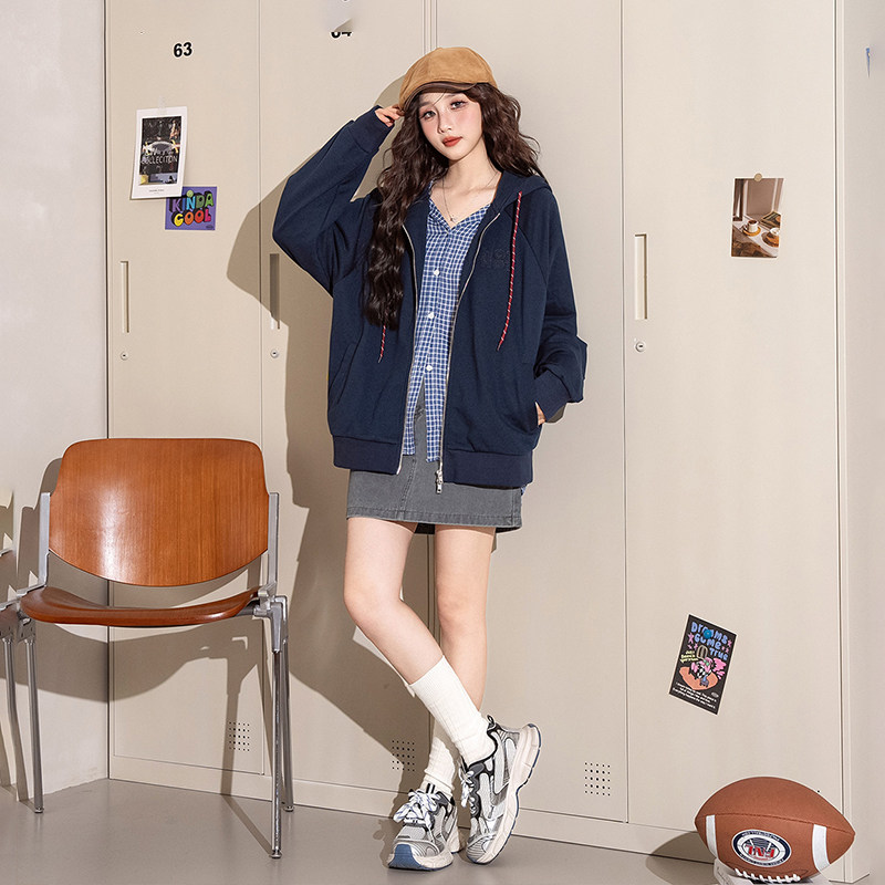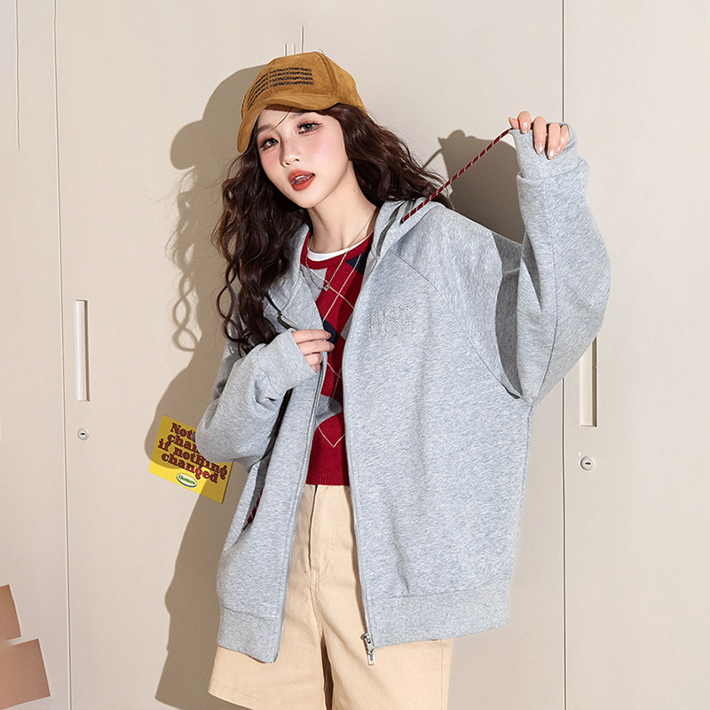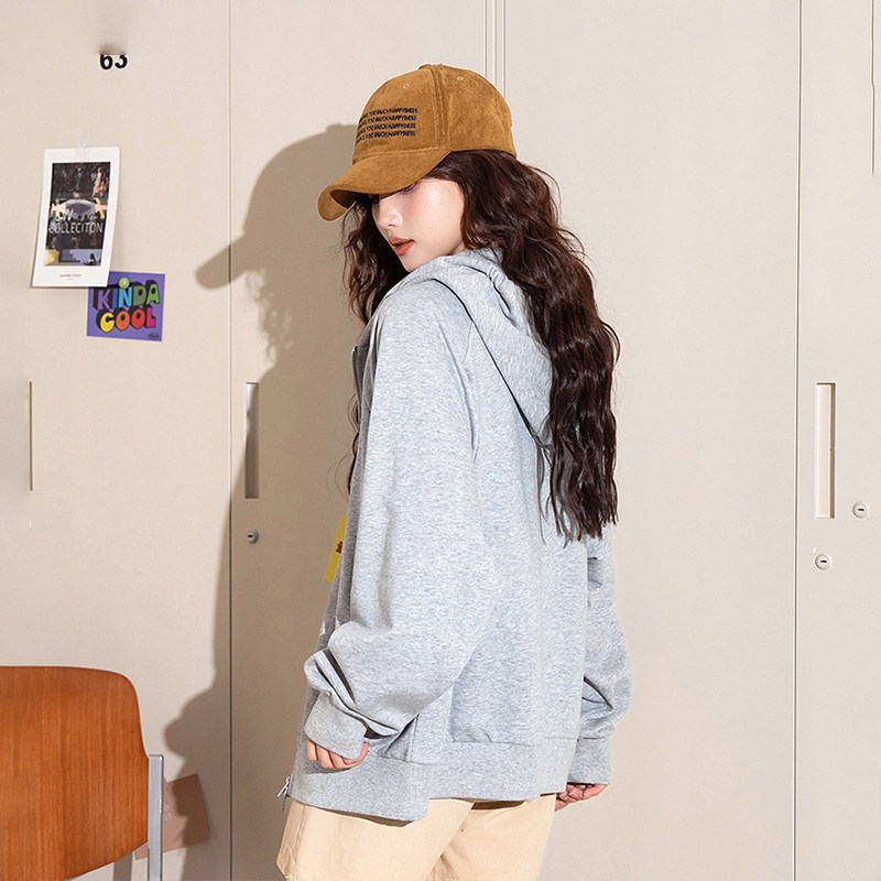 热风女士贴布刺绣学院风减龄连帽卫衣外套25秋季女款宽松显瘦