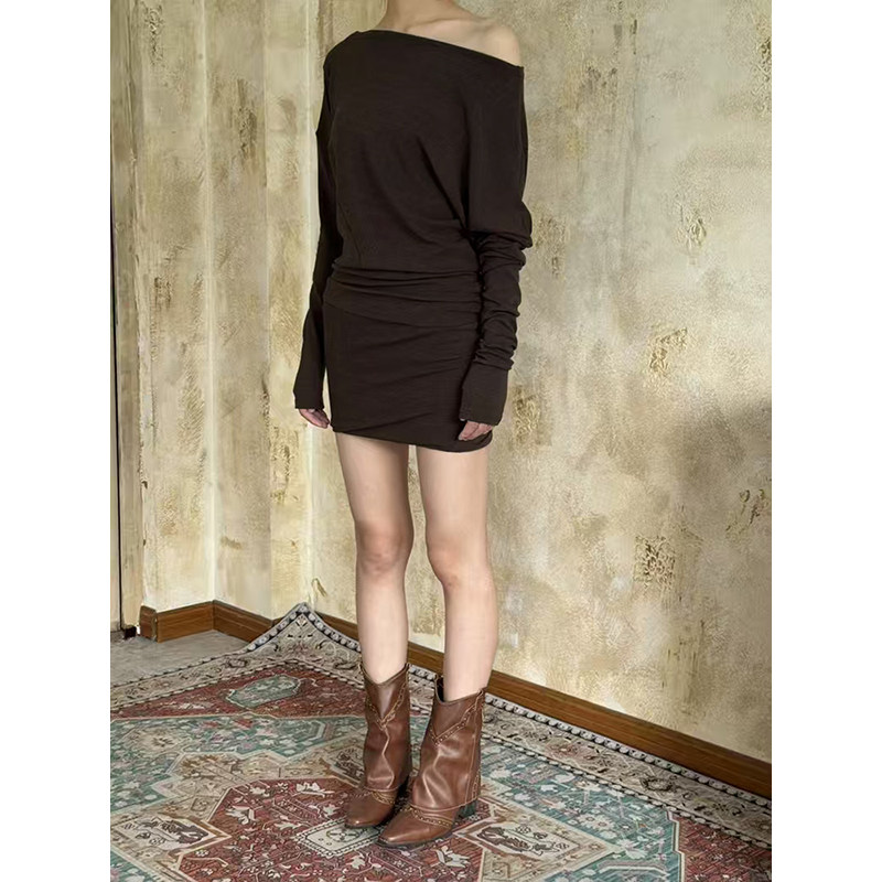MosesQueen魔西女王咖色斜肩长袖连衣裙春秋褶皱收腰显瘦包臀短裙