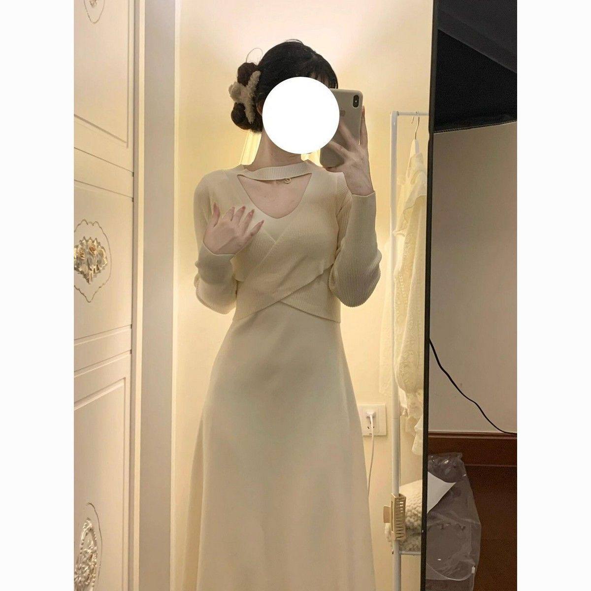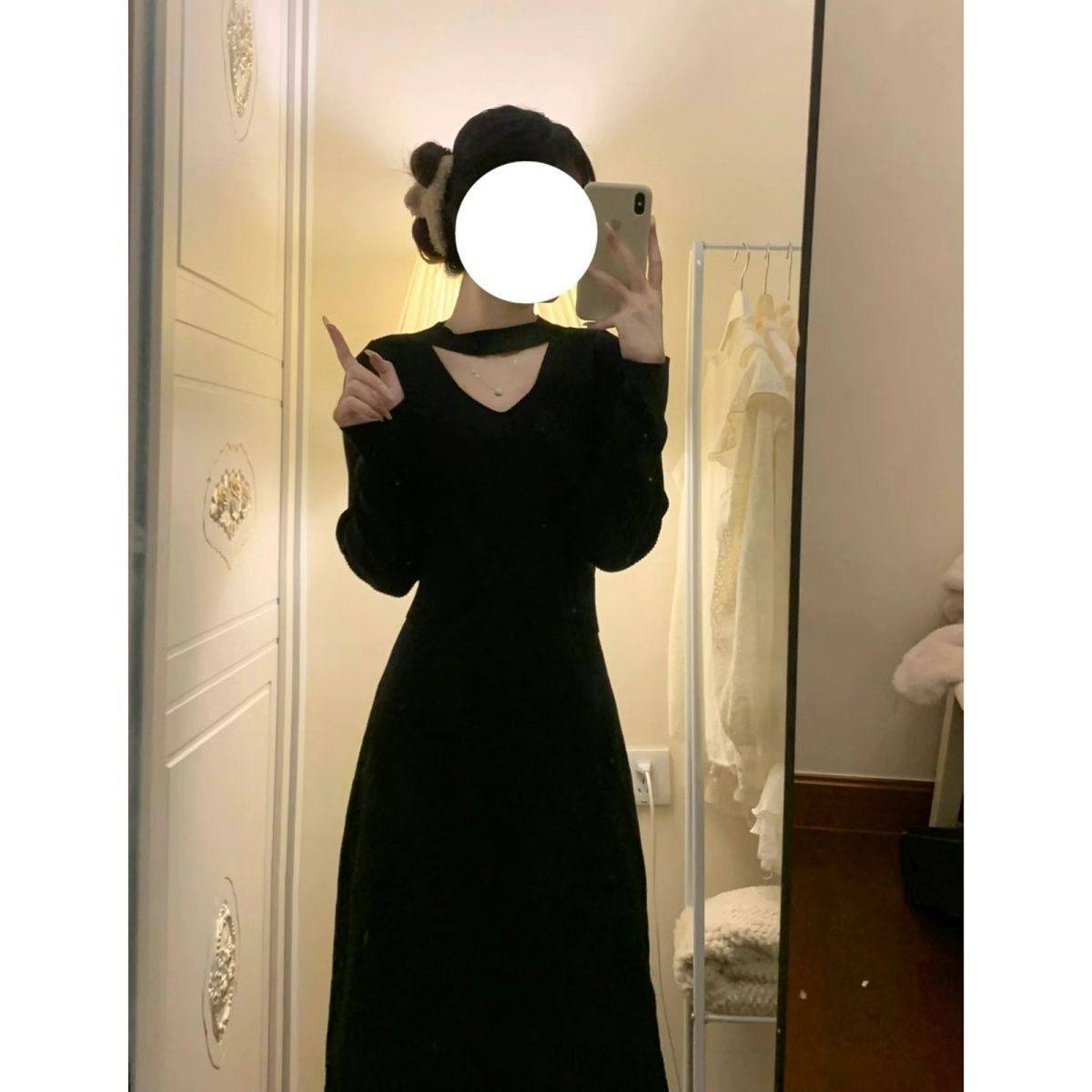 小香风V领收腰黑色针织连衣裙女秋冬配大衣长款过膝打底a字毛衣裙