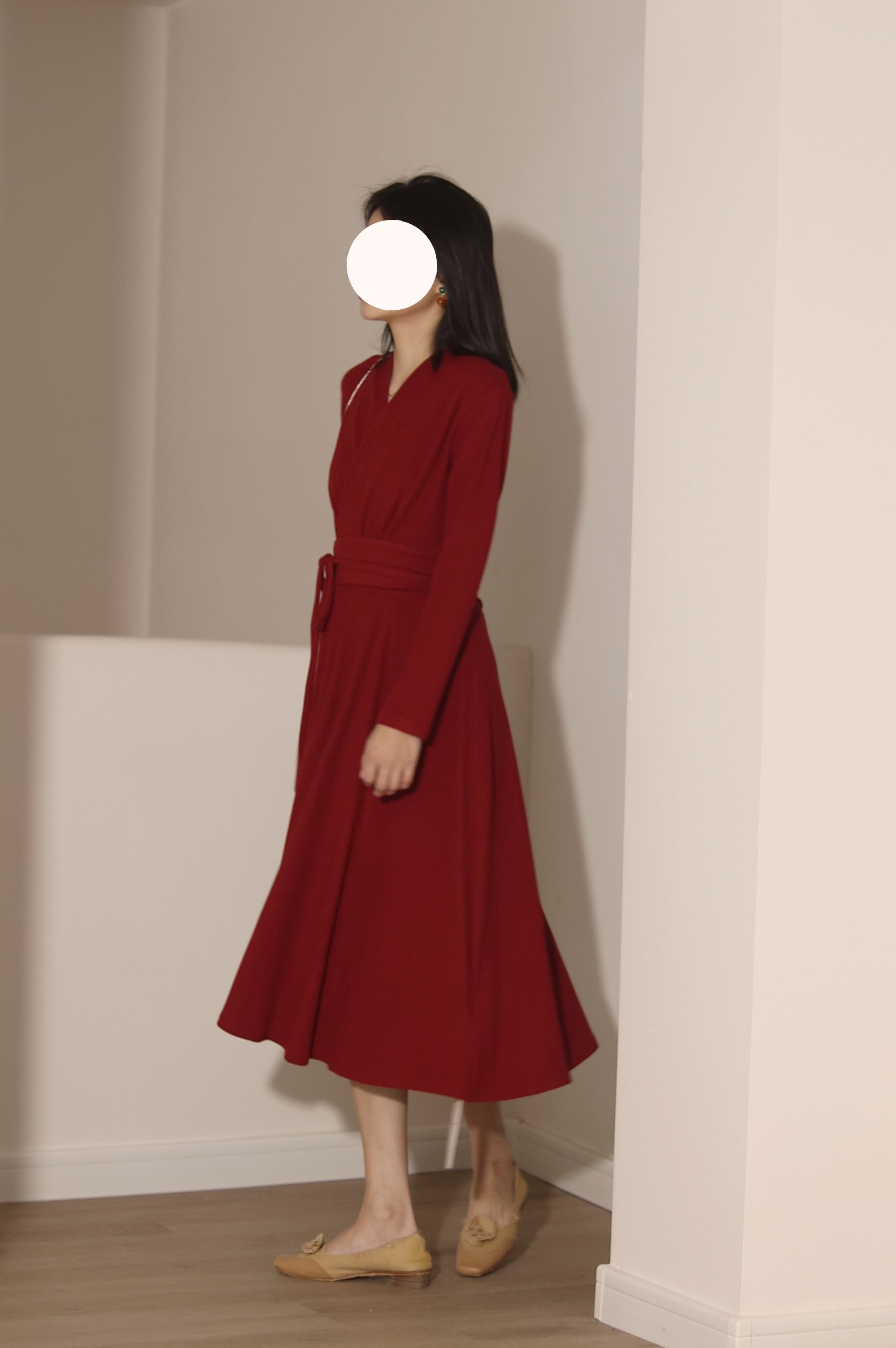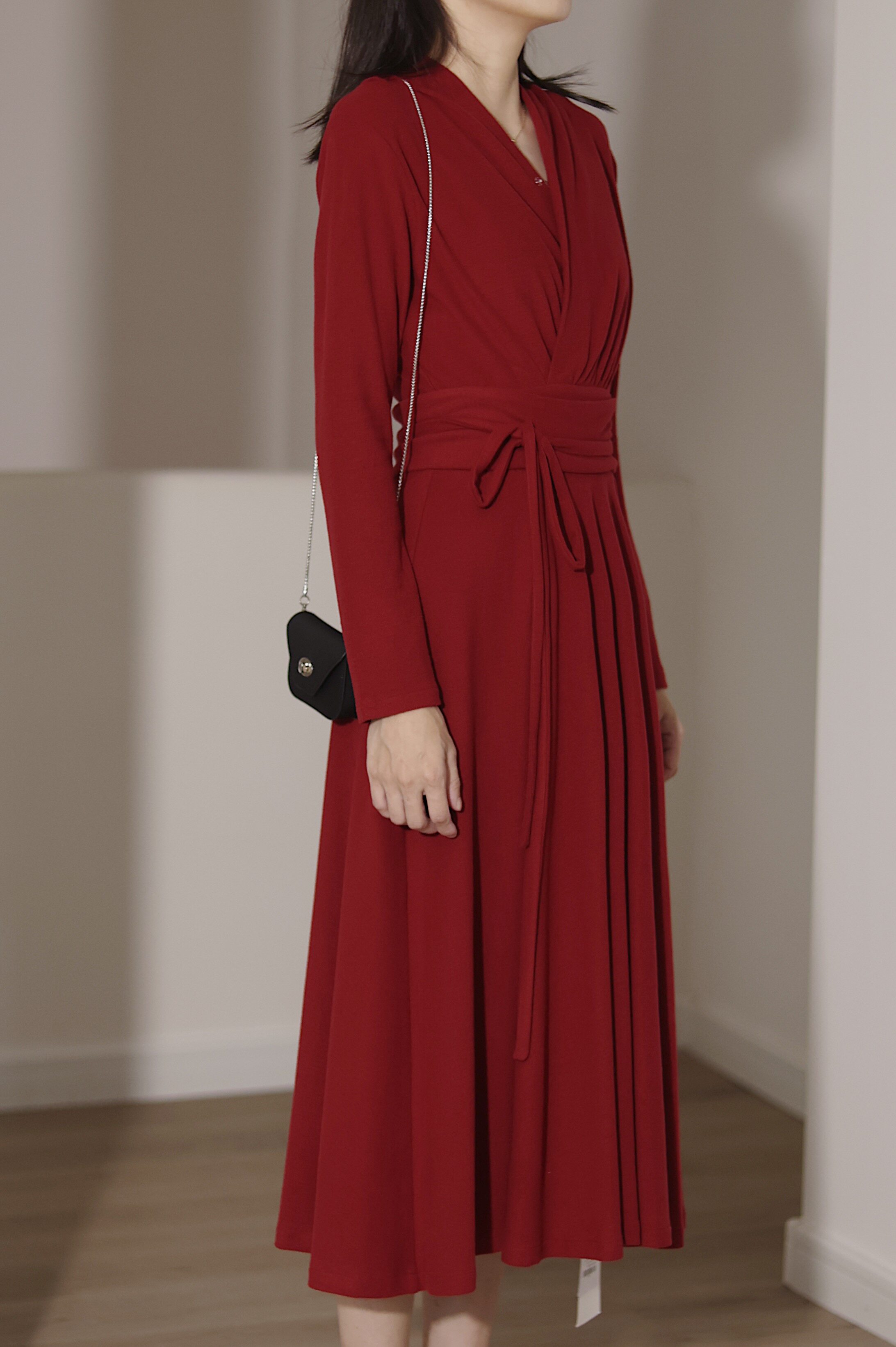 喵吉 法式复古V领长袖收腰打底裙小个子中长款红色针织连衣裙女秋
