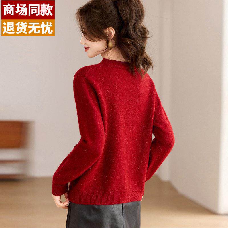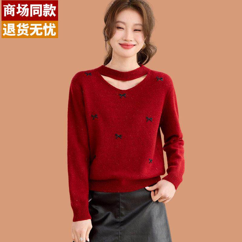 红色毛衣女款2026新款秋冬羊毛打底衫高级设计感挂脖上衣配裙子