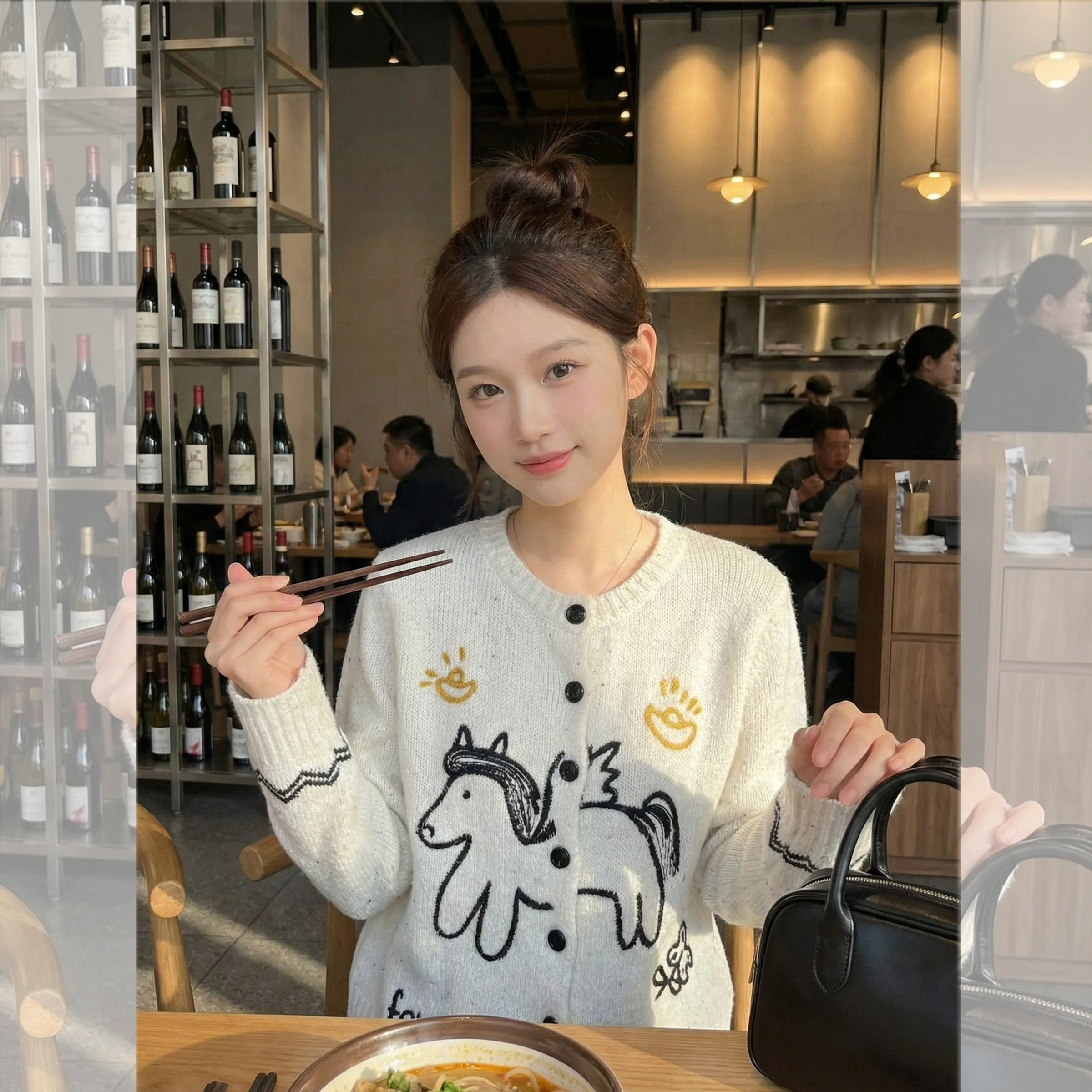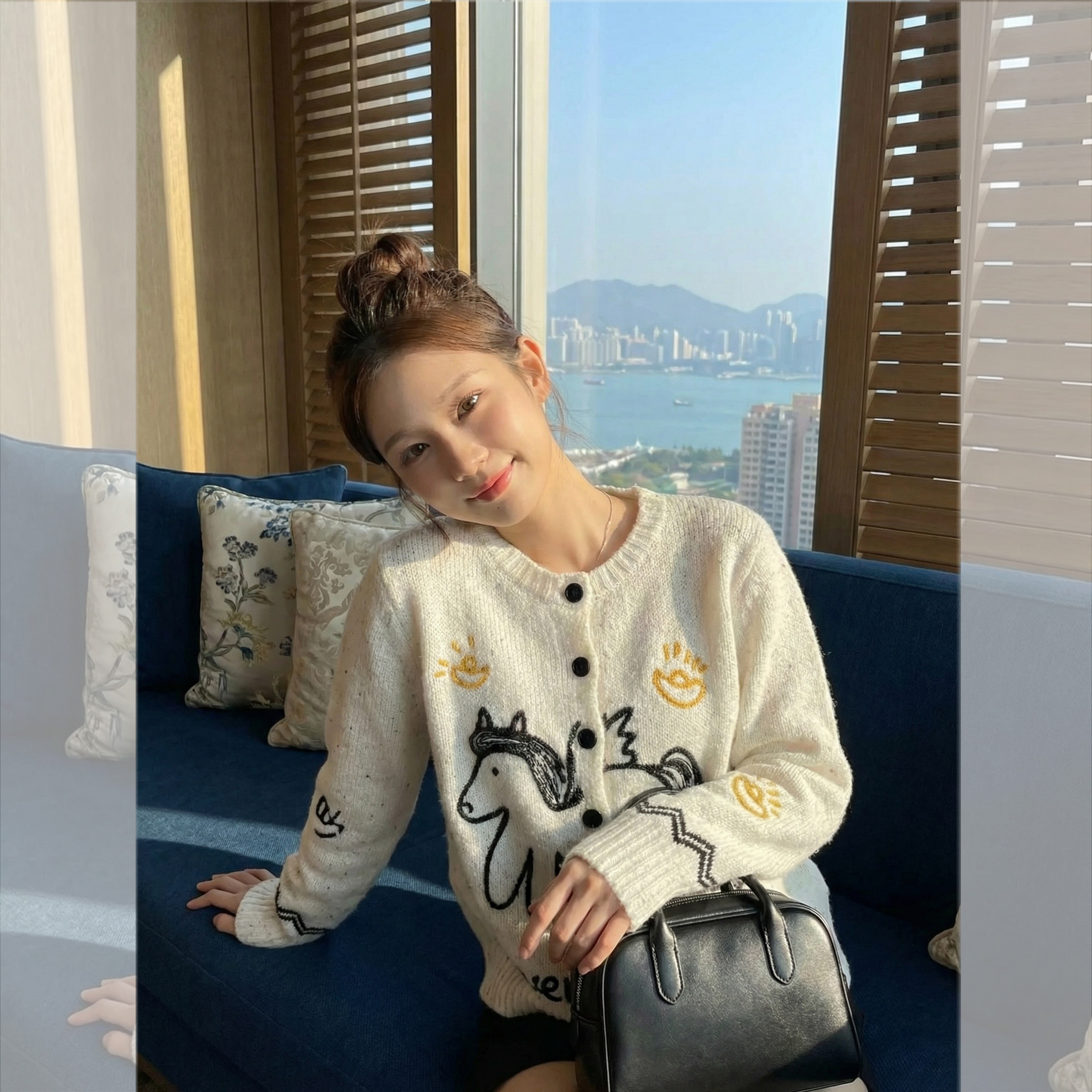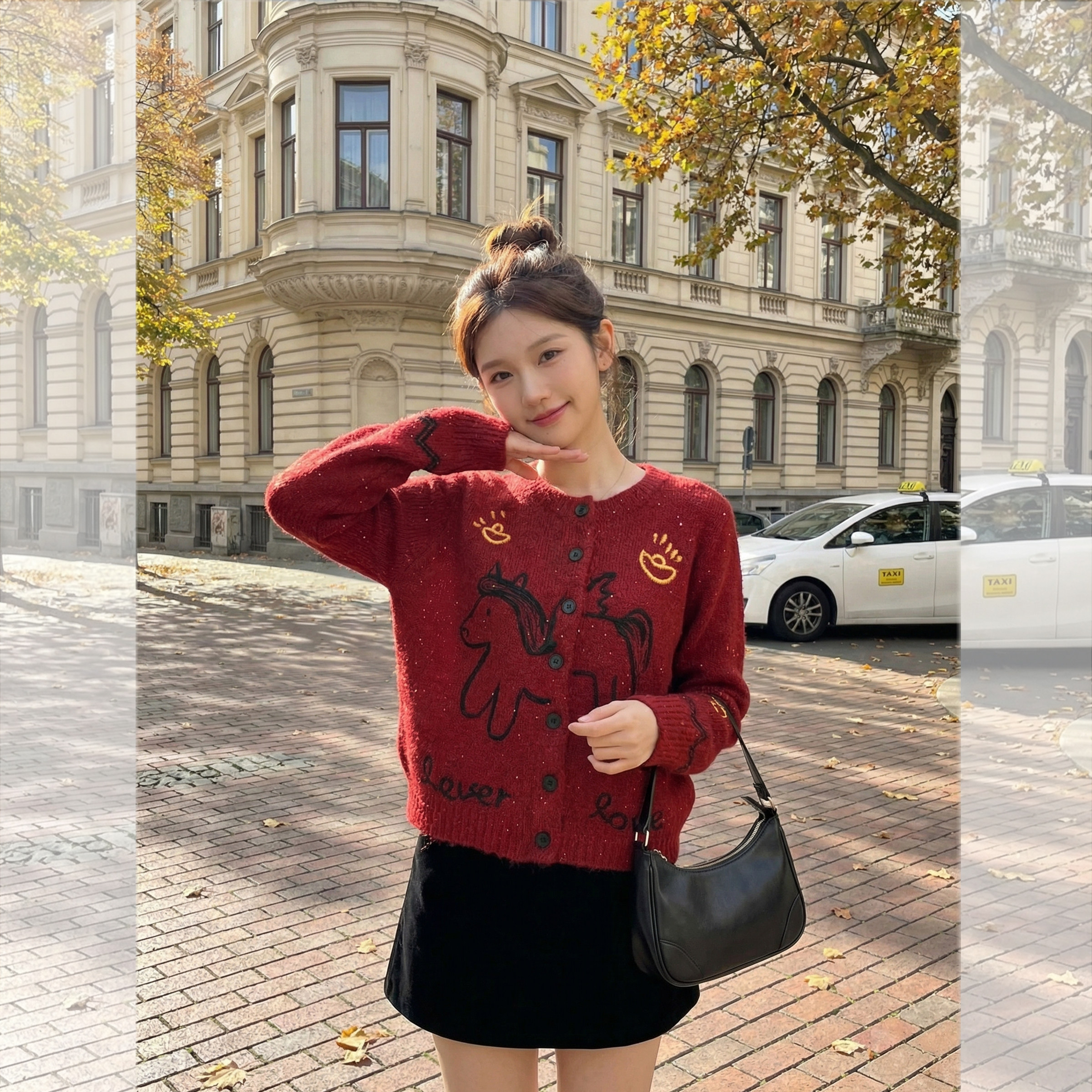 钟菲菲毛衣女款2026新款刺绣宽松针织衫开衫外套过年红马年羊毛衣